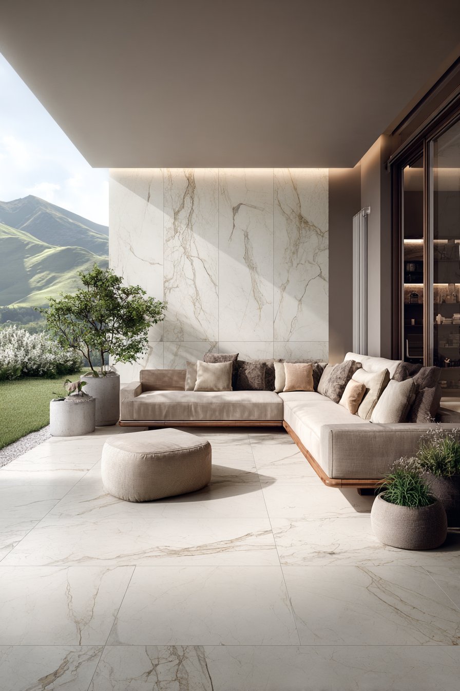 Style marble-look walls with upscale outdoor furniture in neutral linen or performance fabrics, sleek modern planters in complementary gray tones, and minimal accessories that allow the stone-look installation to command attention. The refined elegance established by marble-look tiles elevates entire outdoor spaces, creating environments suitable for formal entertaining or quiet luxury. Strategic lighting highlights the veining patterns while creating evening ambiance worthy of five-star resorts.