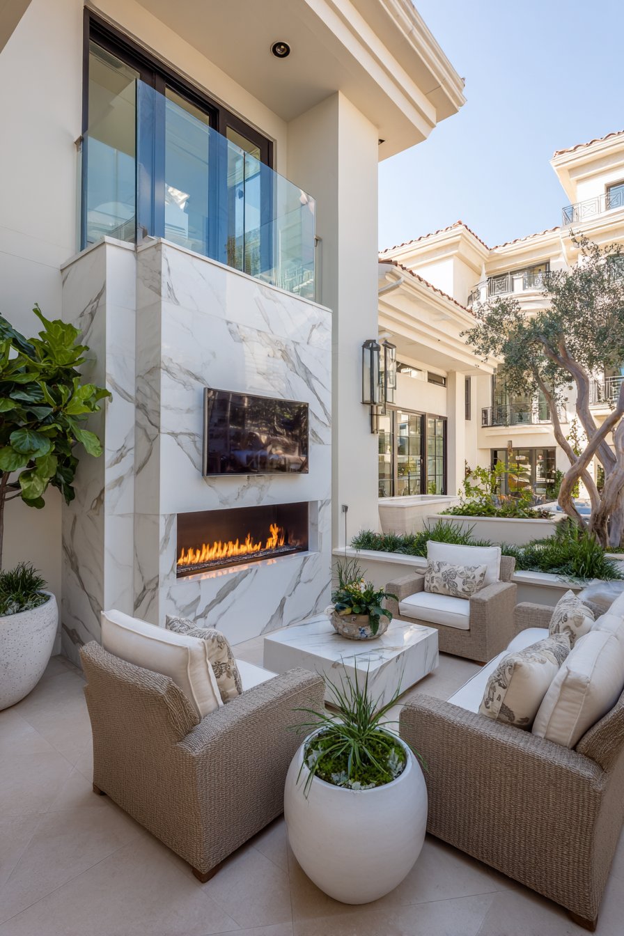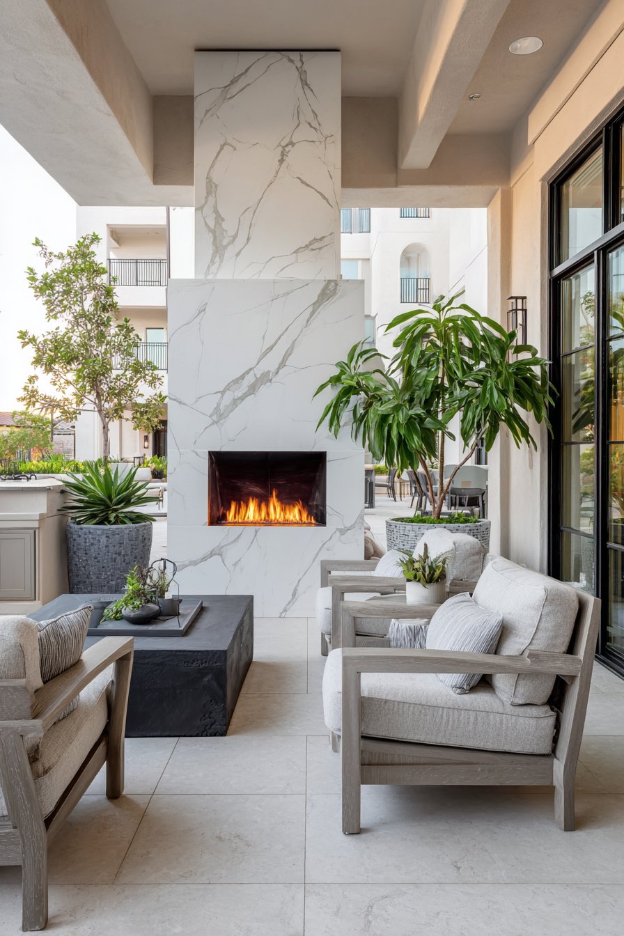 Book-matched marble-look porcelain slabs create ultra-luxurious outdoor feature walls that rival high-end interior installations. These large-format tiles—often 5 feet tall or larger—minimize grout lines while showcasing dramatic gray veining on white backgrounds. The book-matching technique mirrors veining patterns across adjacent slabs, creating symmetrical designs that emphasize the stone’s natural beauty while demonstrating installation craftsmanship. This approach brings interior luxury standards to exterior spaces, creating outdoor rooms worthy of the most sophisticated homes.