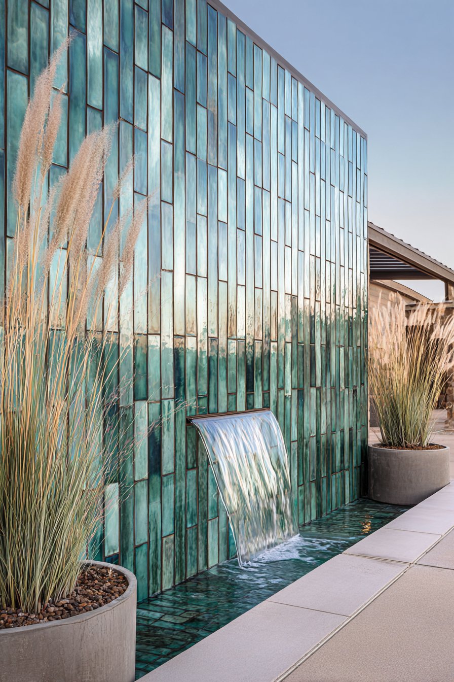 Iridescent glass mosaic tiles in ocean blues and turquoises create shimmering water-inspired walls that transform pool areas into resort-like destinations. These translucent tiles catch and refract sunlight, creating color-shifting effects that respond to viewing angles and lighting conditions. The dynamic quality mimics water’s movement and light reflection, establishing immediate connections between the tiled feature and the adjacent pool while creating visual continuity across the outdoor space.
