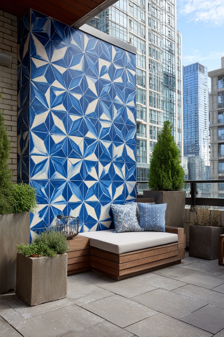 Glossy subway tiles in deep teal blue transform compact urban balconies into jewel-box retreats that maximize visual impact in limited square footage. The rich color saturation provides personality and style while the reflective glaze bounces light around the space, creating the illusion of greater depth. This smart design choice proves that small outdoor areas can deliver just as much style as expansive patios when thoughtful tile selection creates focus and drama.