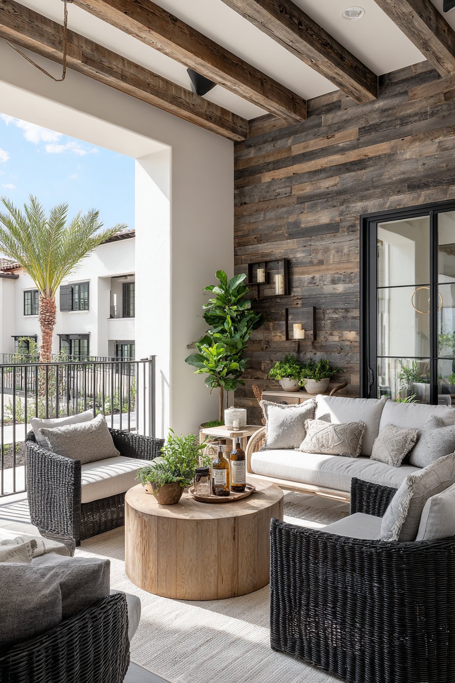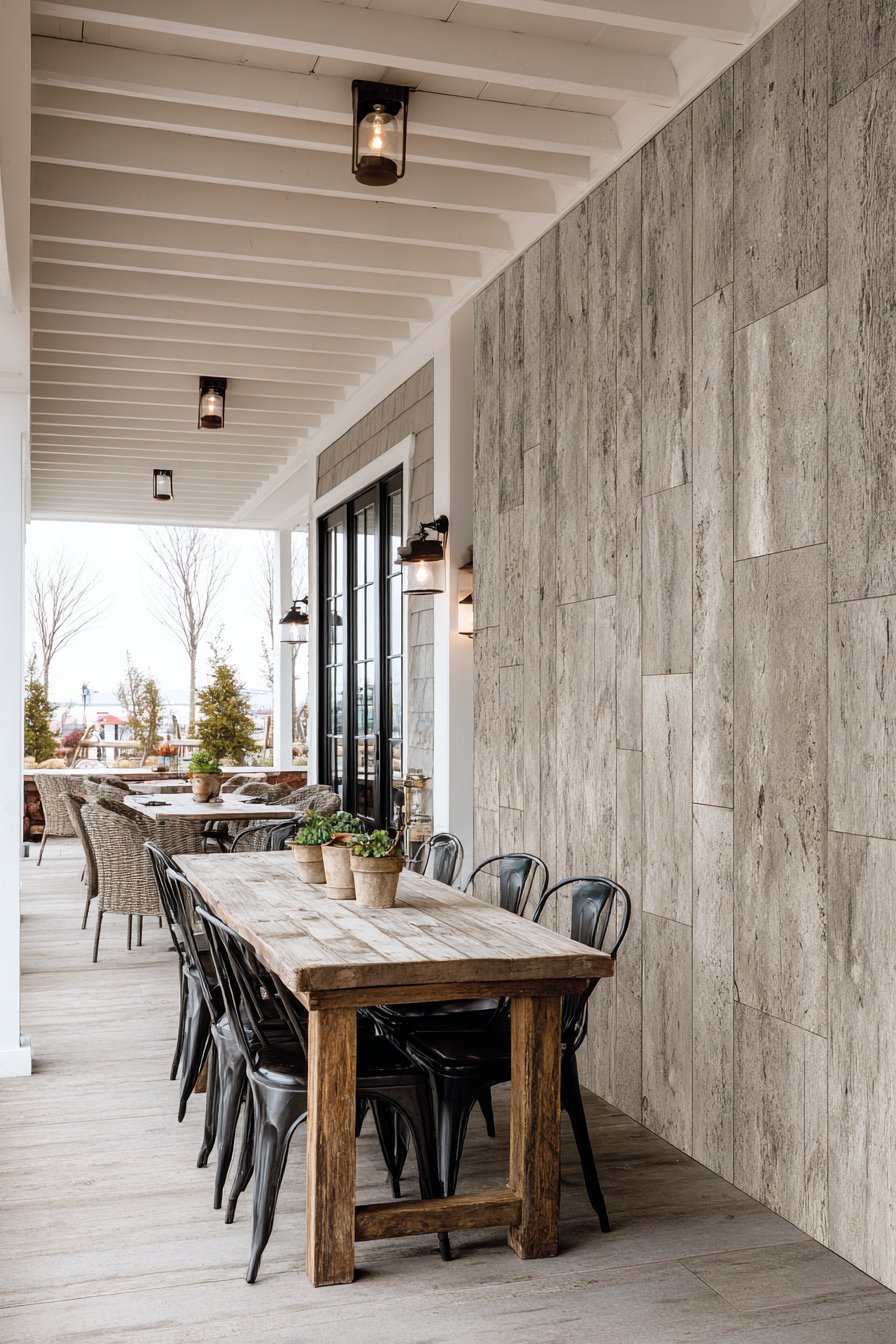 The rustic charm of weathered wood creates instant warmth in outdoor covered porches and patio areas. When installed on exterior walls beneath white-washed beams or corrugated metal roofing, these tiles complete the modern farmhouse aesthetic that remains popular across diverse regions. The neutral gray-brown tones provide a versatile backdrop that complements vintage-style outdoor furniture, galvanized metal accents, and the mix of old and new elements characteristic of farmhouse design.