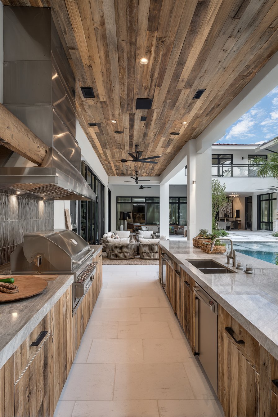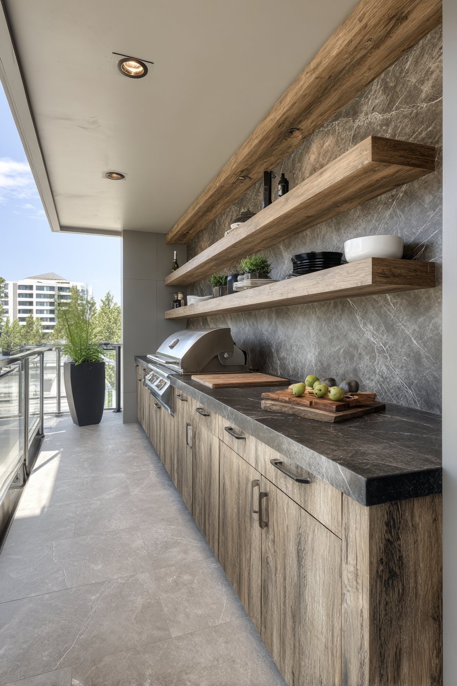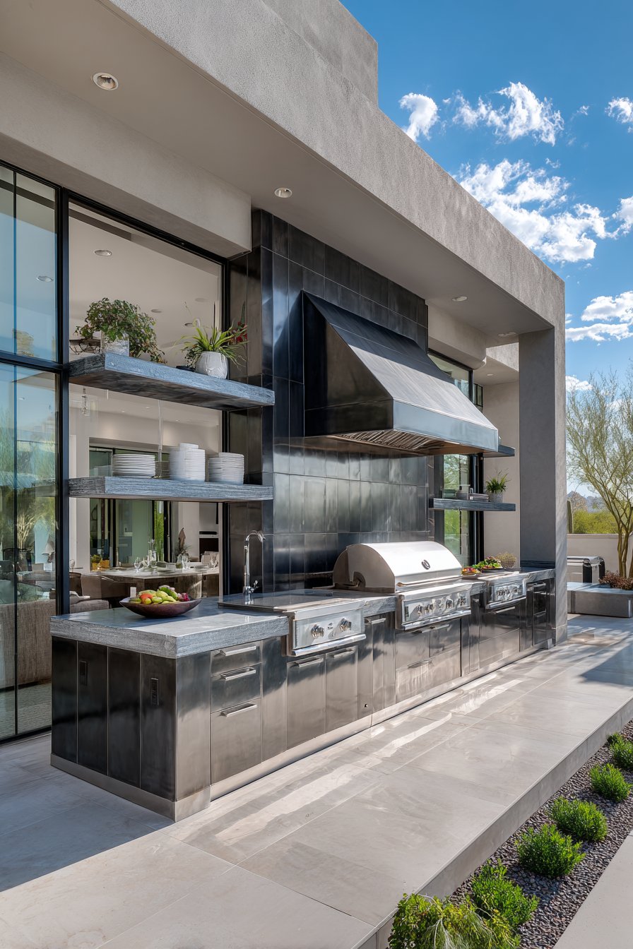 The reflective quality of steel-look tiles helps bounce light throughout outdoor cooking areas, improving visibility for food preparation while creating a sense of spaciousness. The neutral metallic tone coordinates effortlessly with stainless steel appliances and hardware, creating visual cohesion across all kitchen elements. Built-in shelving against tiled walls provides practical storage for outdoor dinnerware, serving pieces, and cooking implements while maintaining the clean, professional aesthetic.