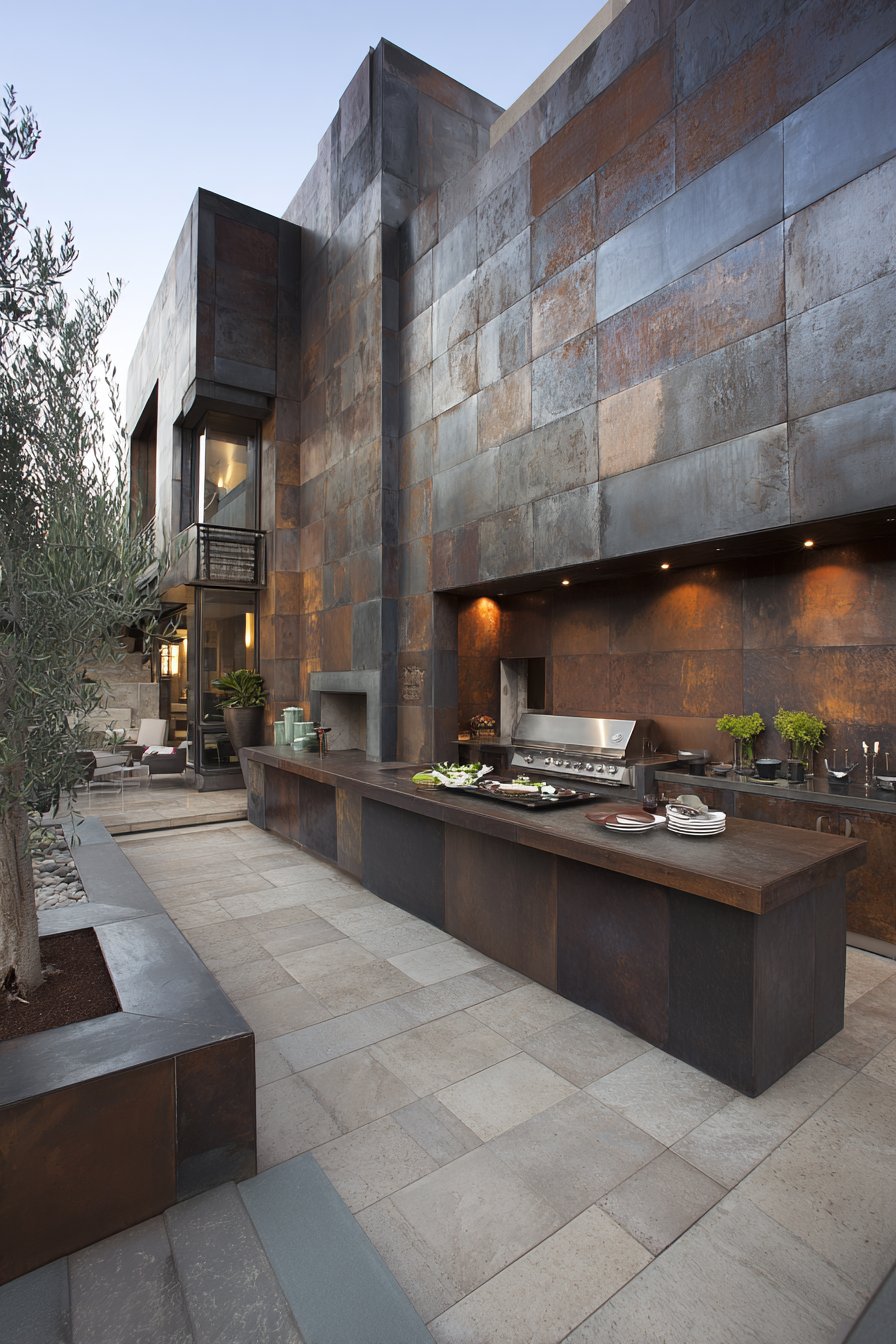 Stainless steel-look porcelain tiles create the ultimate backdrop for outdoor kitchens, combining restaurant-grade aesthetics with residential approachability. The metallic finish reflects light beautifully while providing an easy-to-clean surface behind grills, food prep areas, and outdoor sinks. These tiles replicate the industrial appearance of commercial kitchens while offering superior outdoor durability compared to actual metal panels that can show water spots, rust, or heat damage over time.