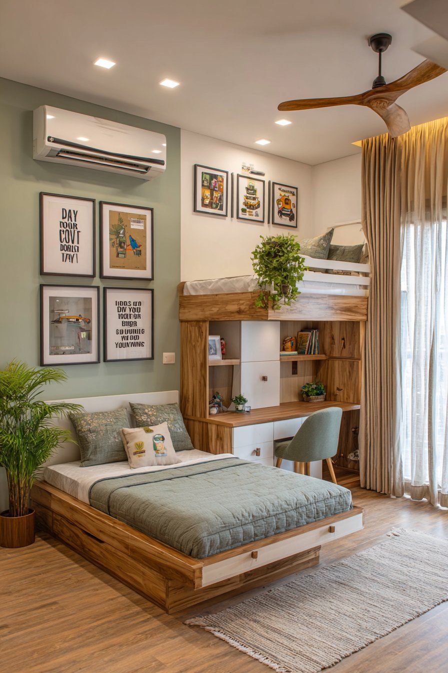 Maximizing vertical space is perhaps the most transformative strategy for small PG rooms, and the loft bed concept exemplifies this principle beautifully. Picture a thoughtfully designed elevated sleeping platform that opens up the entire floor area beneath for a comprehensive study zone. The bed frame, constructed from sturdy metal or solid wood, sits approximately five to six feet above the ground, creating a spacious work environment underneath. Integrated storage compartments within the loft structure hold bedding, books, and personal items, eliminating the need for additional furniture that would consume precious floor space.