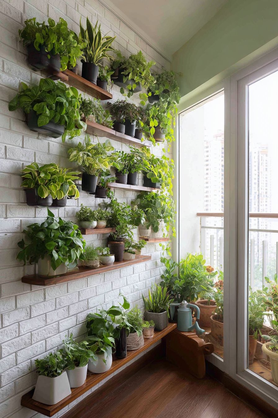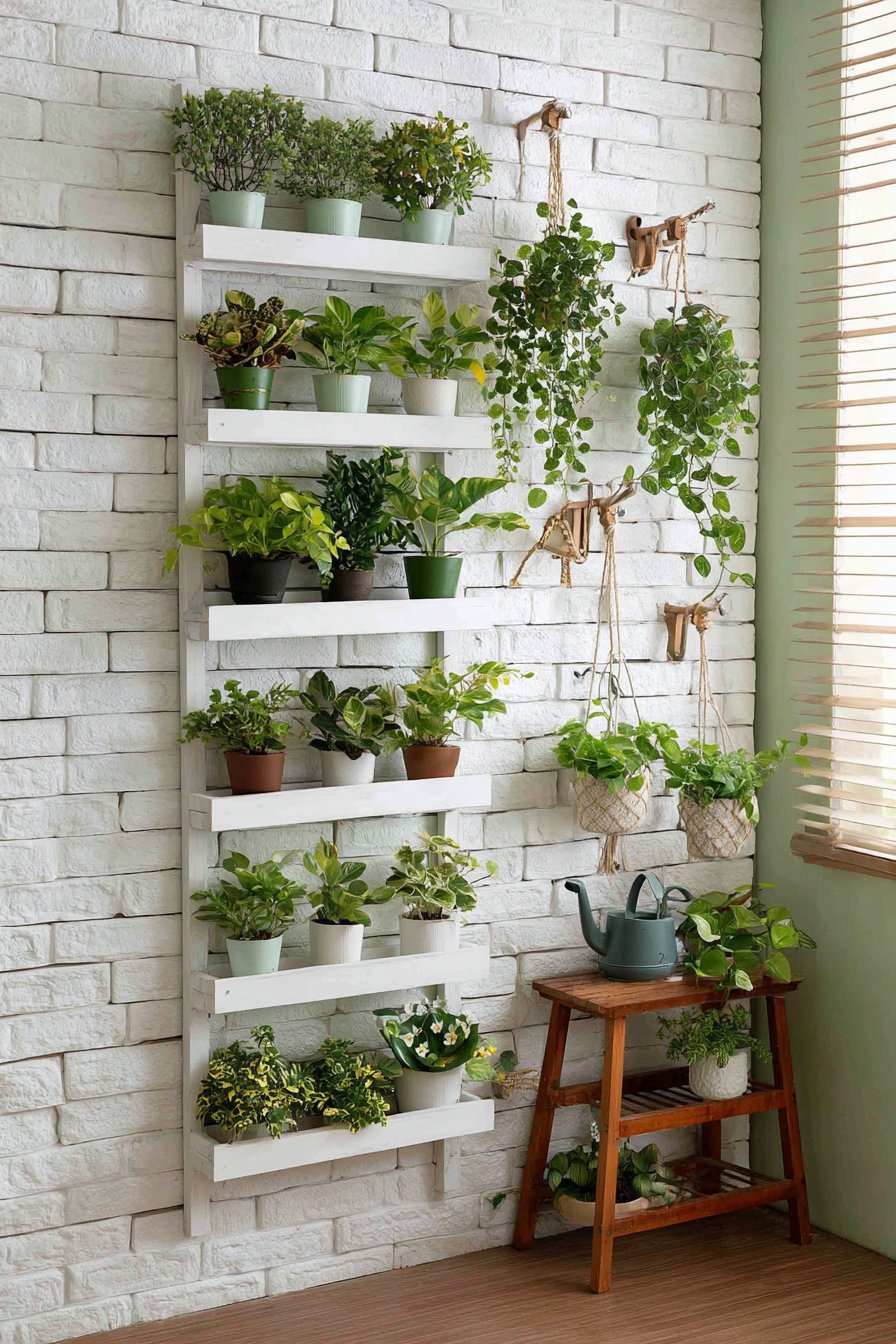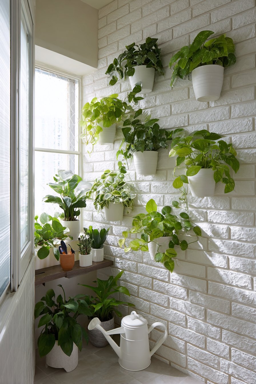 The backdrop of white brick-textured wallpaper creates architectural interest that complements the organic plant shapes while providing a clean, modern canvas. The wallpaper’s textured surface adds dimension without competing with the plants for visual attention. Positioning this living wall near a window ensures adequate natural light for plant health, though most of the recommended varieties tolerate lower light conditions, making them perfect for PG rooms where window access may be limited.