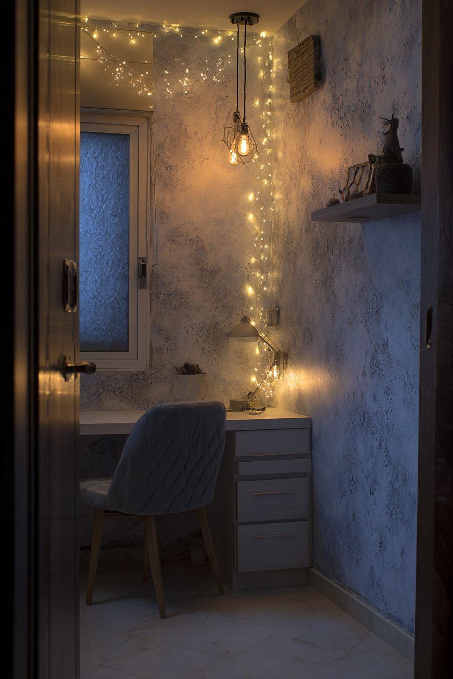 Fairy lights strung artistically across one wall add magical ambient lighting perfect for evening relaxation. These lights create gentle pools of warm illumination that reduce harsh shadows while establishing a cozy, intimate atmosphere. Their low energy consumption allows them to remain lit for extended periods without concern about electricity bills. The task lamp positioned on the desk provides focused, bright light essential for detailed work like reading, writing, or computer tasks that require reduced eye strain.