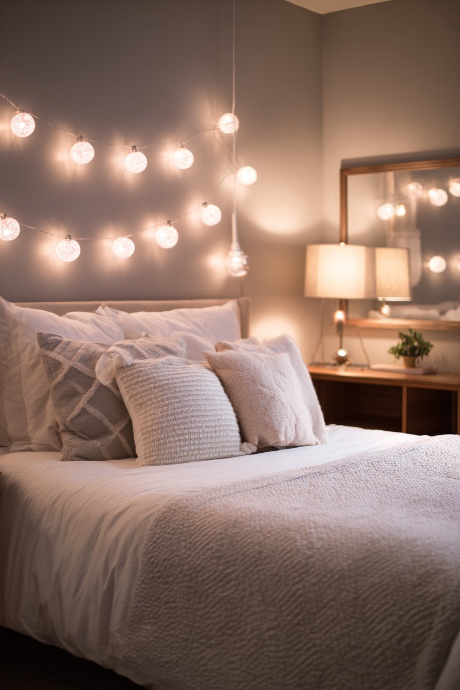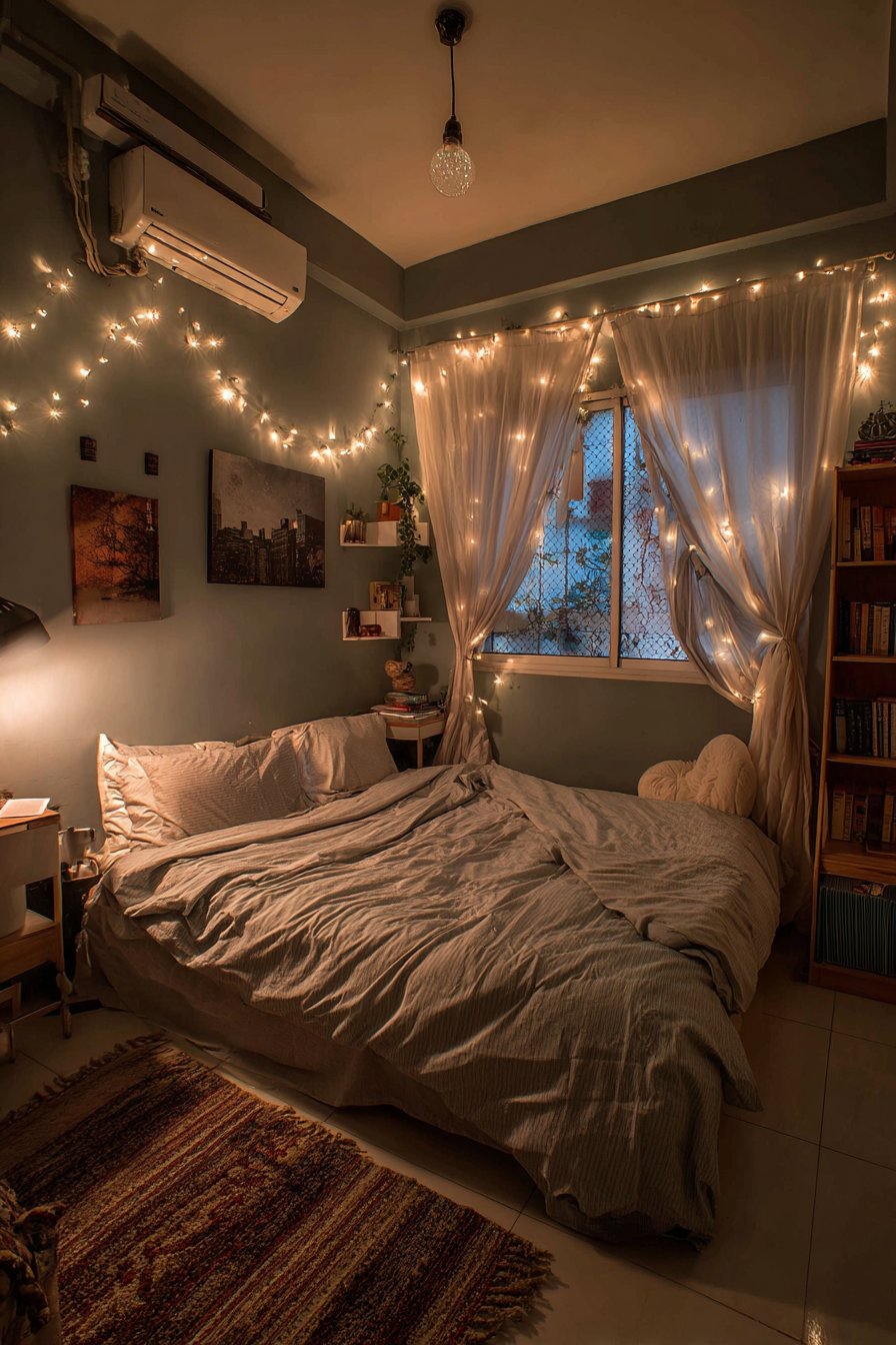 String lights draped along the adjacent walls create enchanting ambient lighting that’s perfect for evening reading sessions. Unlike harsh overhead lighting, these warm-toned fairy lights cast a gentle glow that reduces eye strain and establishes a soothing atmosphere. A compact side table, perhaps repurposed from a vintage wooden stool or a small plant stand, holds a reading lamp with adjustable brightness, ensuring adequate illumination for detailed reading without disturbing roommates in shared accommodations.