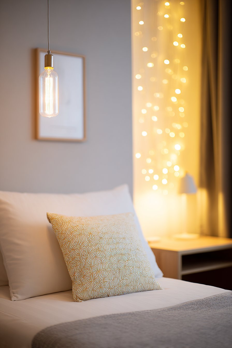 Lighting transforms room ambiance more dramatically than any other single design element, yet it’s often overlooked in PG room decoration. This comprehensive lighting scheme layers three distinct sources to create flexibility and atmosphere. The ceiling pendant light with an Edison bulb provides general ambient illumination with vintage charm, its warm glow distributing light throughout the room for general navigation and basic tasks.