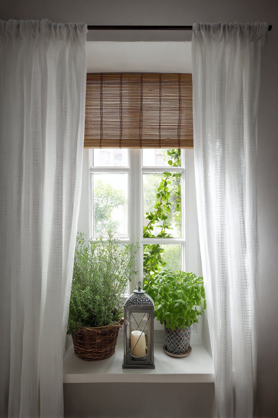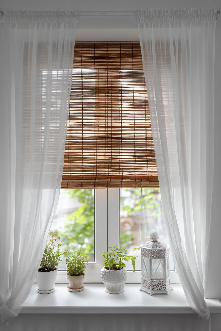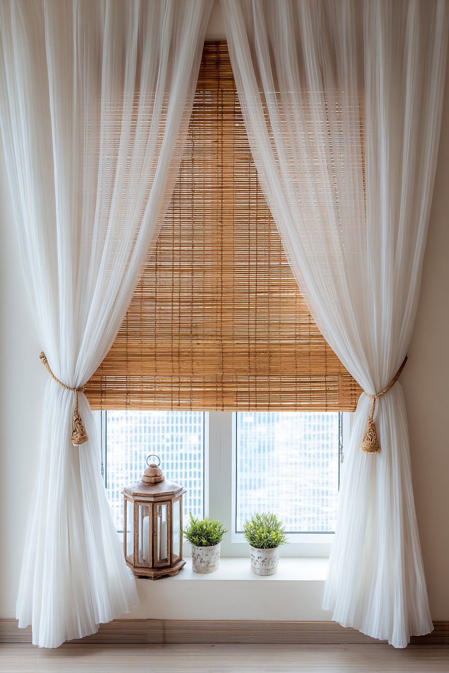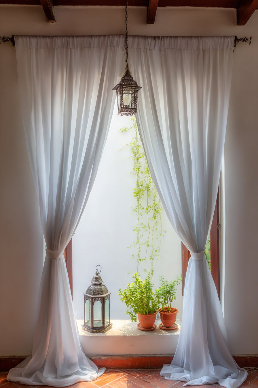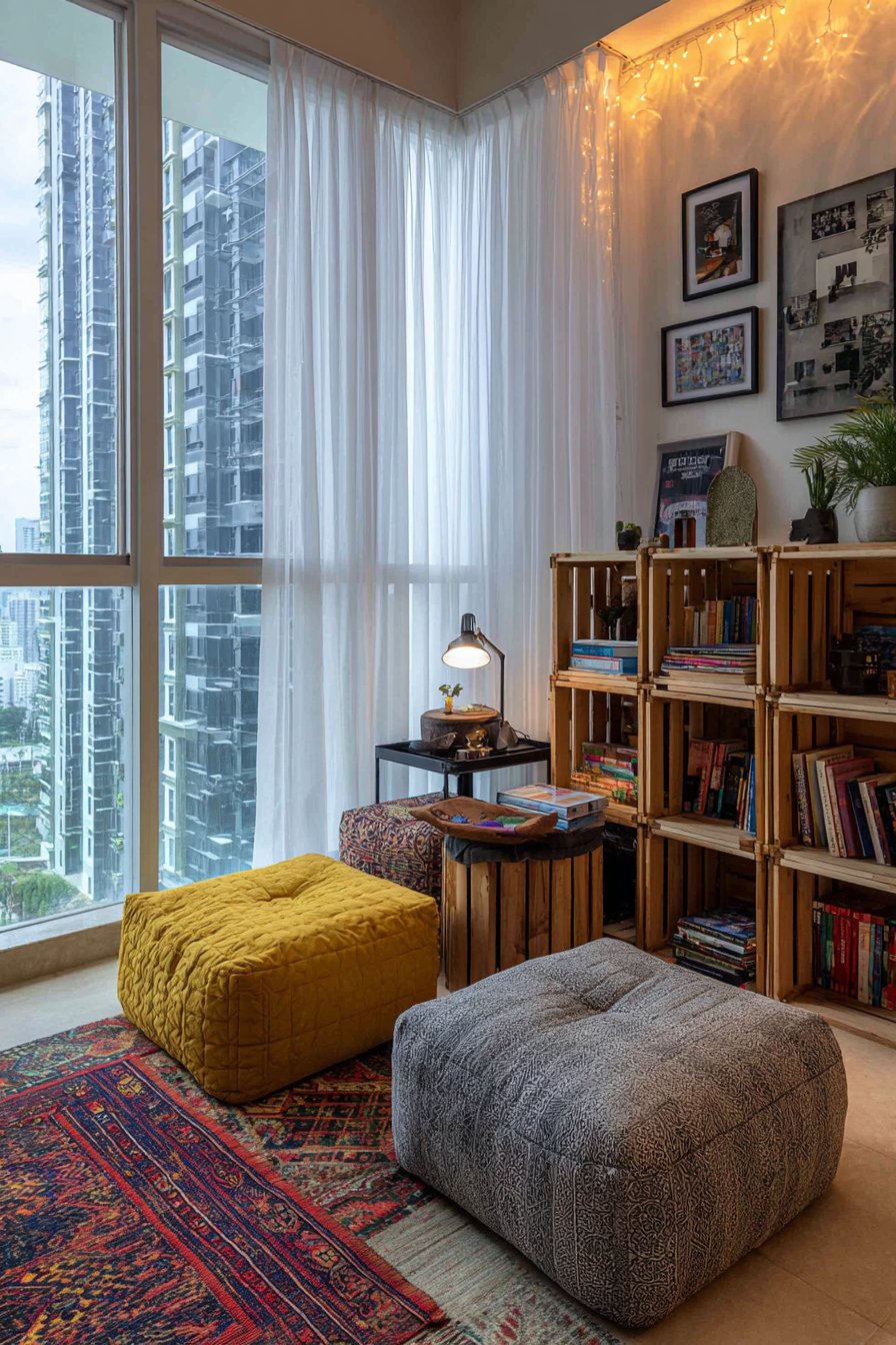 The strategic positioning near a window is essential, as natural daylight provides the best reading conditions during daytime hours. Sheer white curtains soften the incoming light, preventing glare on book pages while maintaining privacy. The textural variety in this corner—from the woven cushion covers to the rough wood of the crates and the soft cotton curtains—creates a rich sensory experience that makes the space feel intentionally designed rather than hastily assembled.
