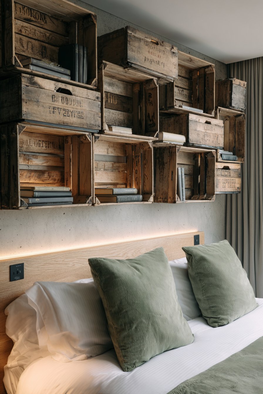- Arrange crate shelves at varying heights to create dynamic visual interest and accommodate books of different sizes