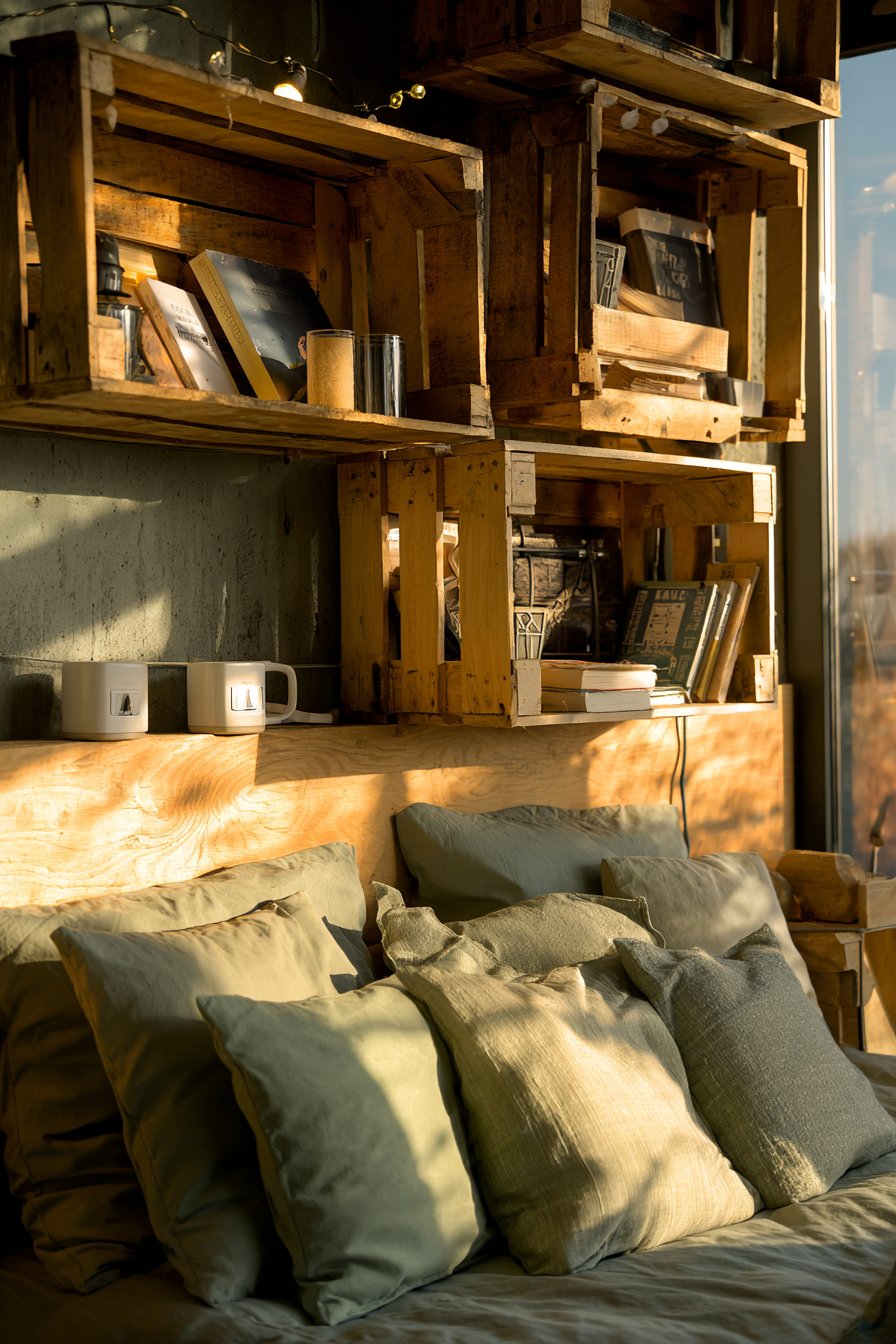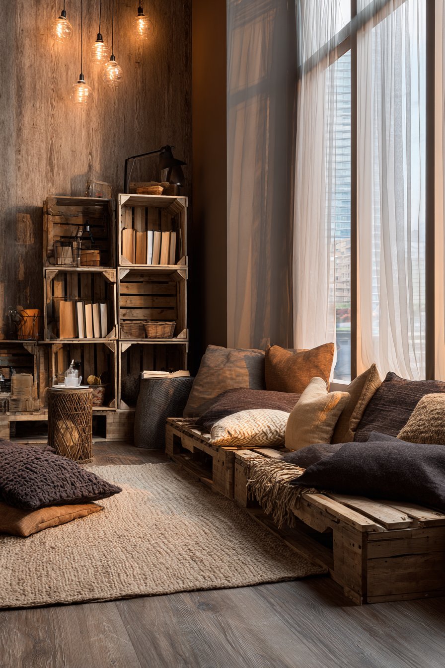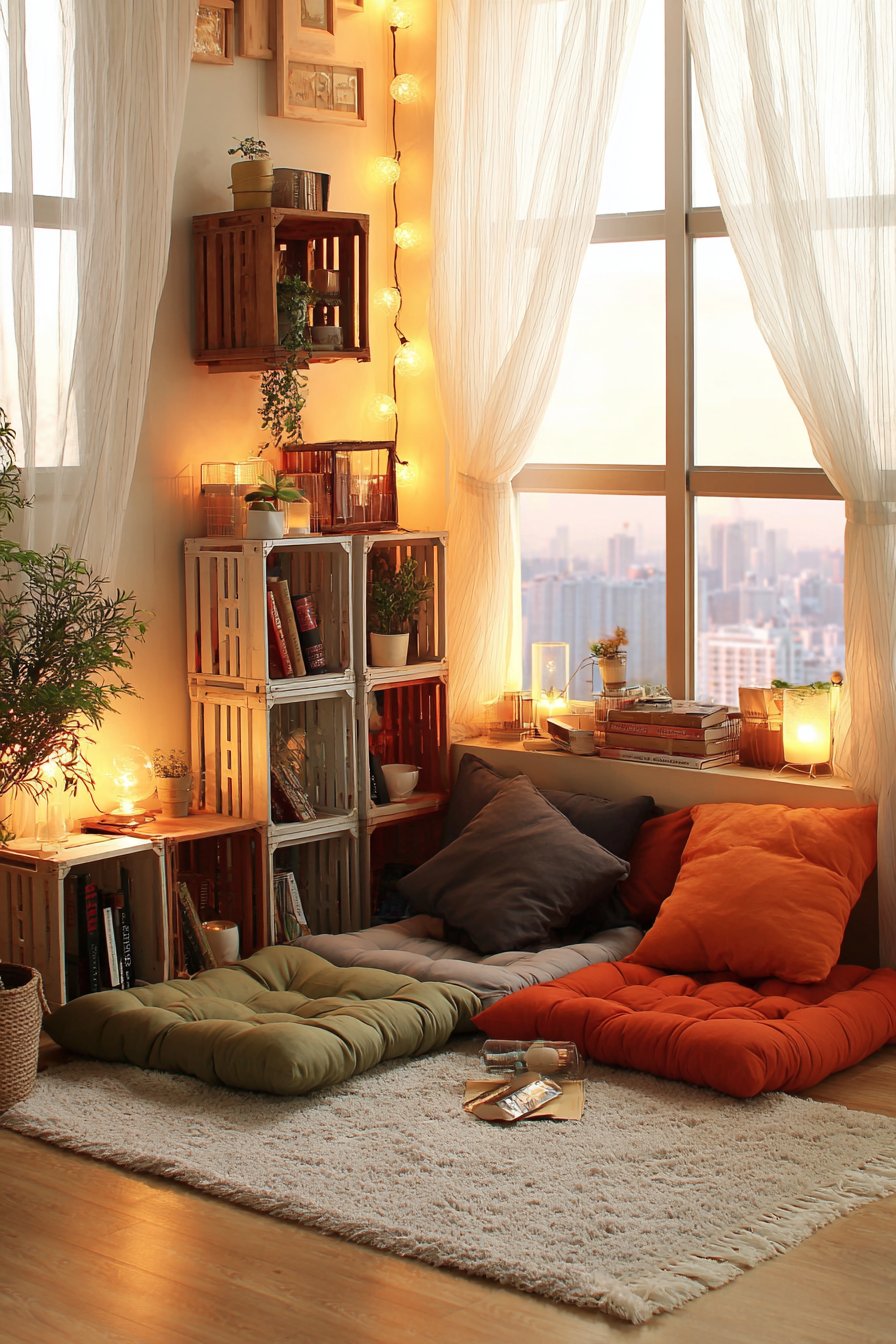 Creating a dedicated reading nook transforms an underutilized corner into a personal escape that encourages relaxation and mindfulness. This design centers around comfortable floor seating with oversized cushions in earthy tones—think terracotta, olive green, and warm beige—arranged on a soft area rug that defines the space. The modular crate bookshelf, stacked in an asymmetrical pattern, adds rustic character while providing ample storage for your growing book collection. Each crate can be positioned differently, creating visual interest and allowing for creative display of books, small plants, and treasured objects.