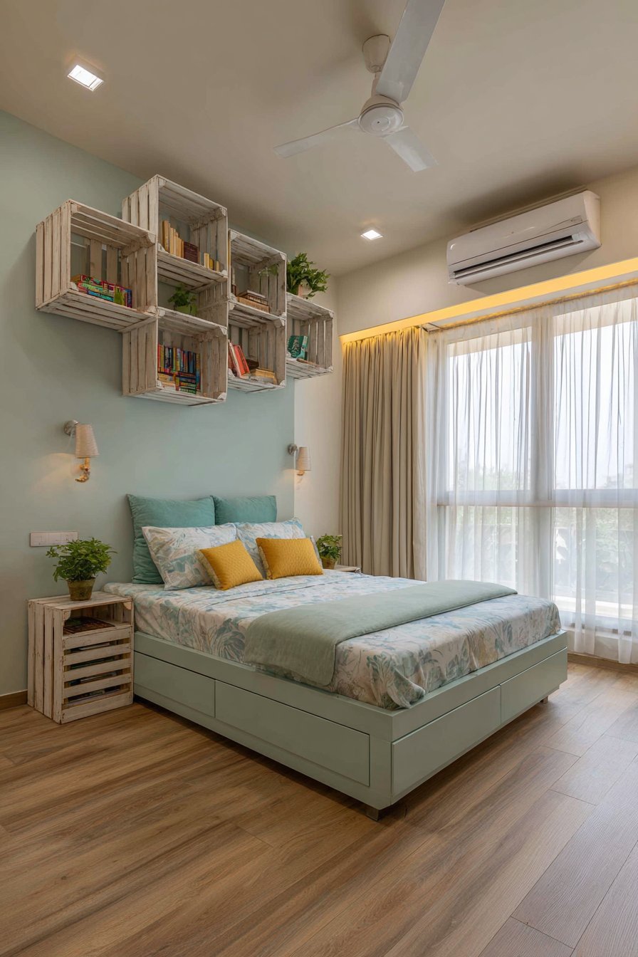Under-bed storage represents one of the most underutilized spaces in any bedroom, and this design maximizes that potential with neutral-toned storage boxes on wheels. These containers hold off-season clothing, extra linens, shoes, and other items that don’t require daily access. The rolling mechanism ensures easy retrieval without having to move heavy furniture or strain your back reaching into dark corners. The overall effect is a sleeping area that feels thoughtfully curated, peaceful, and remarkably organized despite the limited square footage.