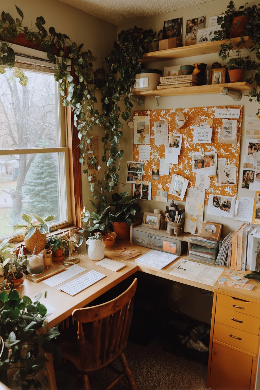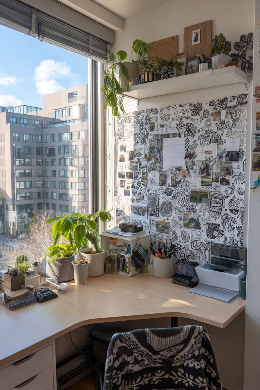 A bulletin board covered in patterned fabric transforms a utilitarian organizational tool into a decorative element. The fabric covering can be changed seasonally or whenever inspiration strikes, providing an easy refresh without replacing the entire board. The bulletin board displays notes, inspiration photos, calendar pages, and deadline reminders, keeping important information visible and top-of-mind. A desk organizer corrals pens, scissors, tape, and other supplies in one defined location, preventing the dreaded desk drawer junk accumulation.