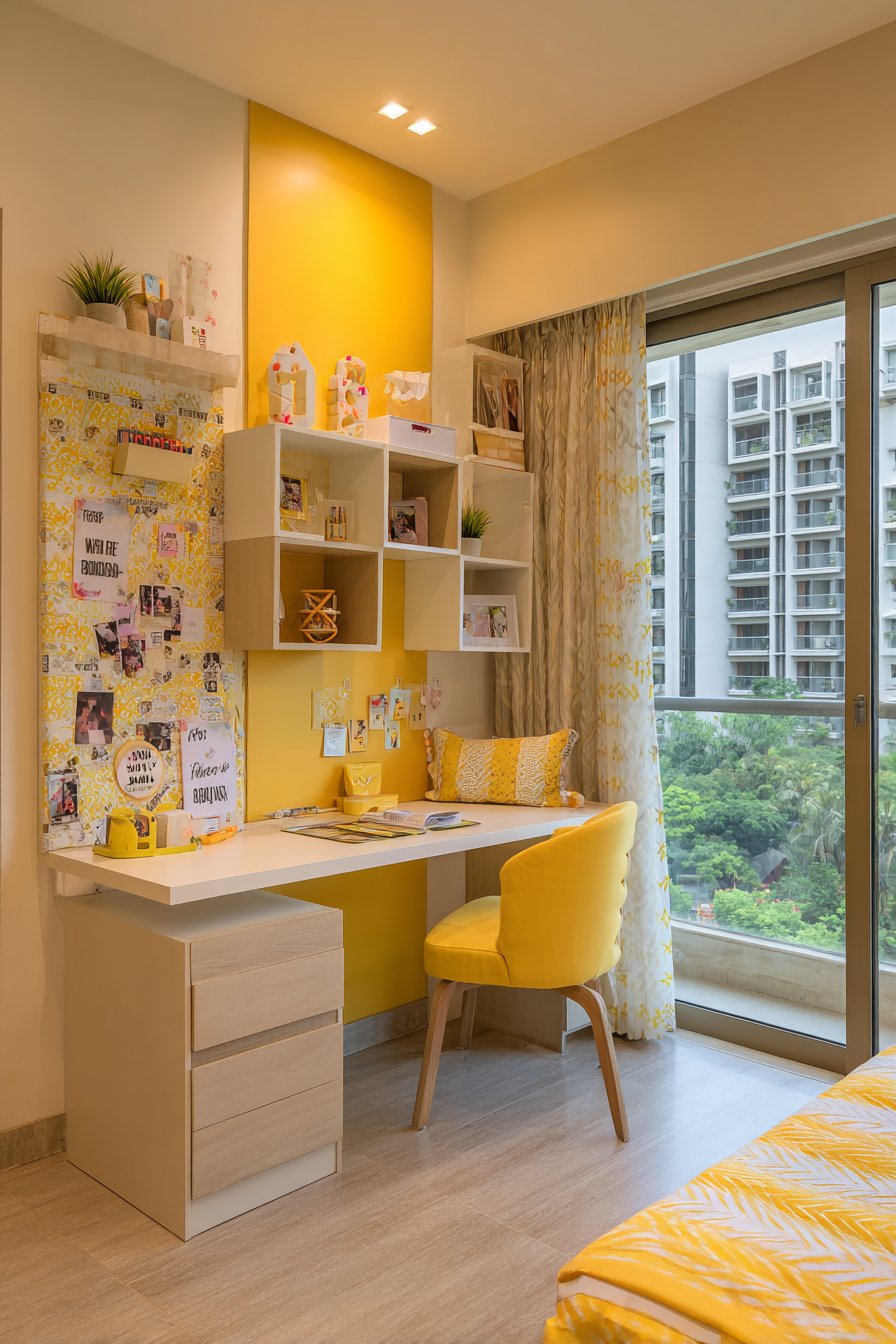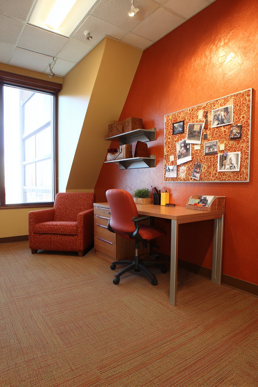 Painting the corner in a contrasting accent color—perhaps a rich terracotta, deep teal, or warm mustard—creates visual differentiation that psychologically separates the workspace from the rest of the room. This color-blocking technique helps your brain recognize when you’ve entered work mode versus relaxation mode, improving focus during study sessions and allowing better disconnection during rest times. A small desk plant adds life and air-purifying benefits without consuming significant surface space.