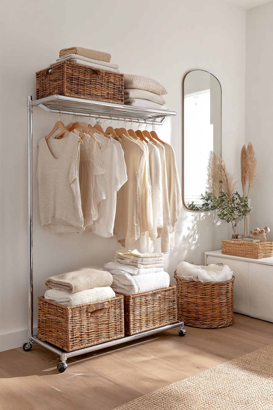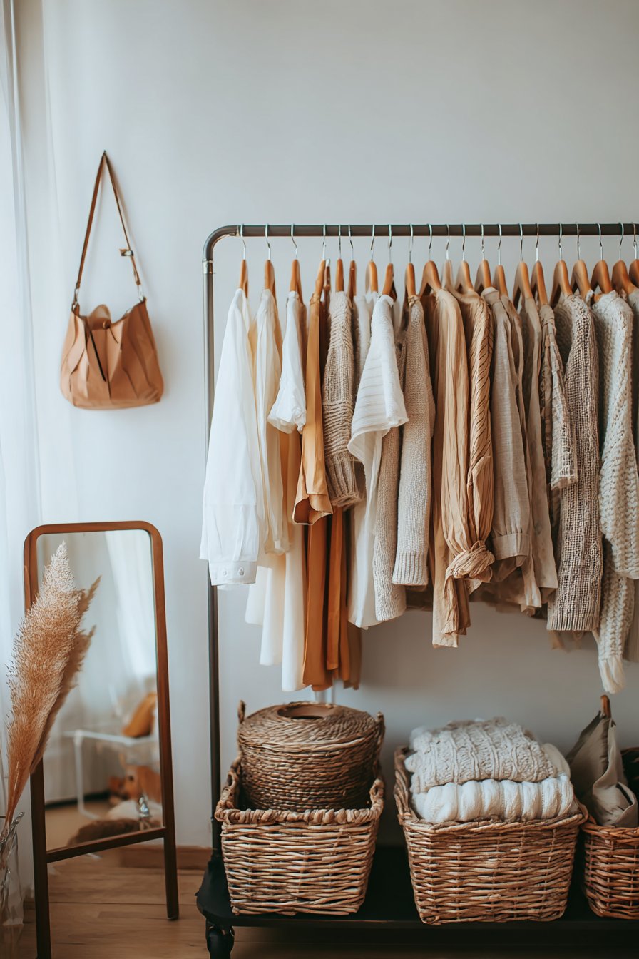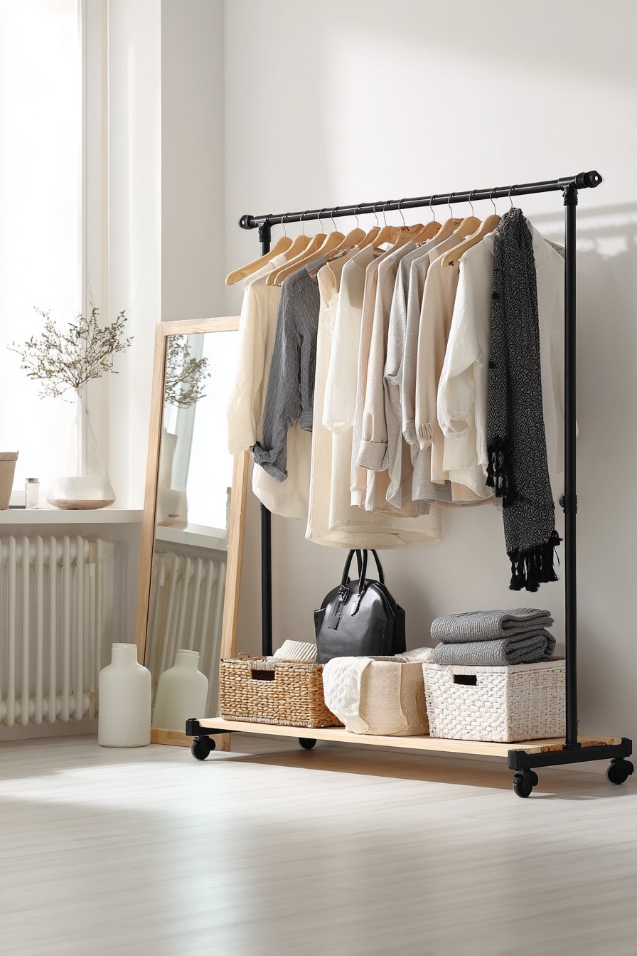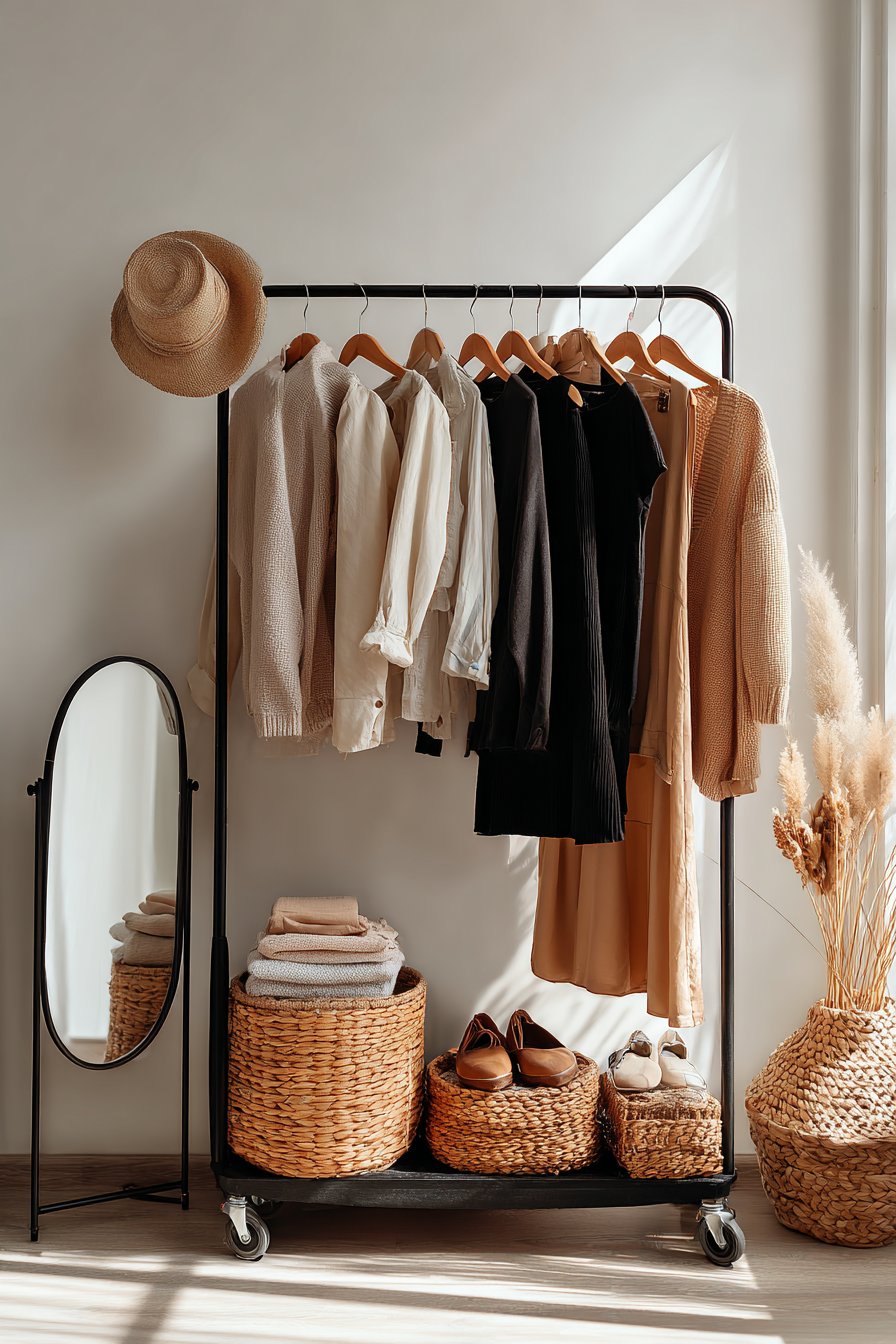 The capsule wardrobe philosophy emphasizes quality over quantity, focusing on versatile pieces in a cohesive color palette that mix and match effortlessly. This design showcases that intentional approach through a rolling garment rack displaying a carefully curated clothing collection on wooden hangers. The uniform hangers create immediate visual order, while organizing garments by type or color creates a pleasing gradient effect that’s both practical and aesthetically pleasing.