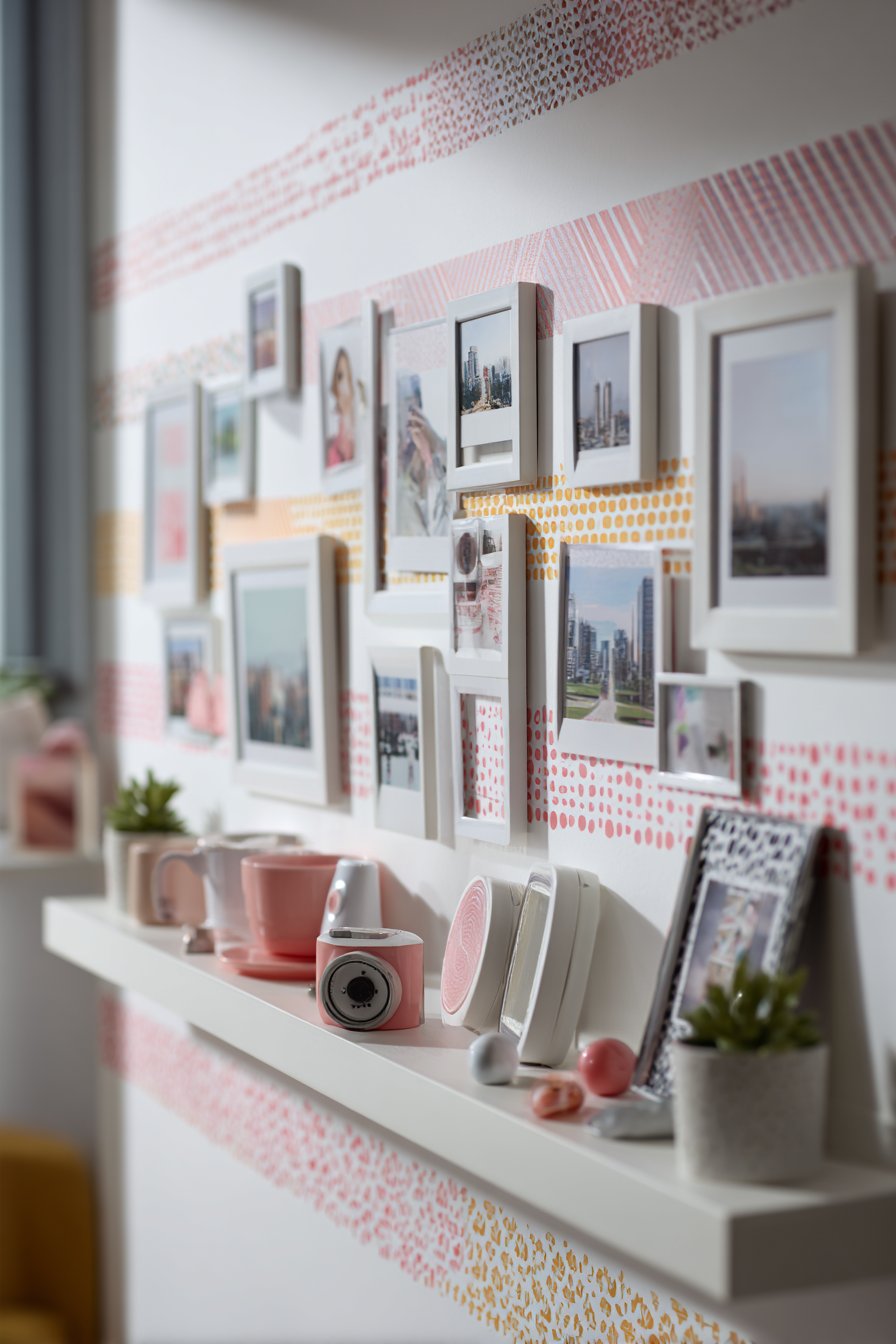 Within the washi tape frames, lightweight prints and polaroid photos create a dynamic gallery that can be updated constantly without additional wall damage. The tape frames can be any size or shape—mixing squares, rectangles, and circles creates visual interest and modern appeal. A floating shelf integrated into the composition displays small three-dimensional objects like succulents, small sculptures, or meaningful souvenirs that add depth to the otherwise flat wall surface.