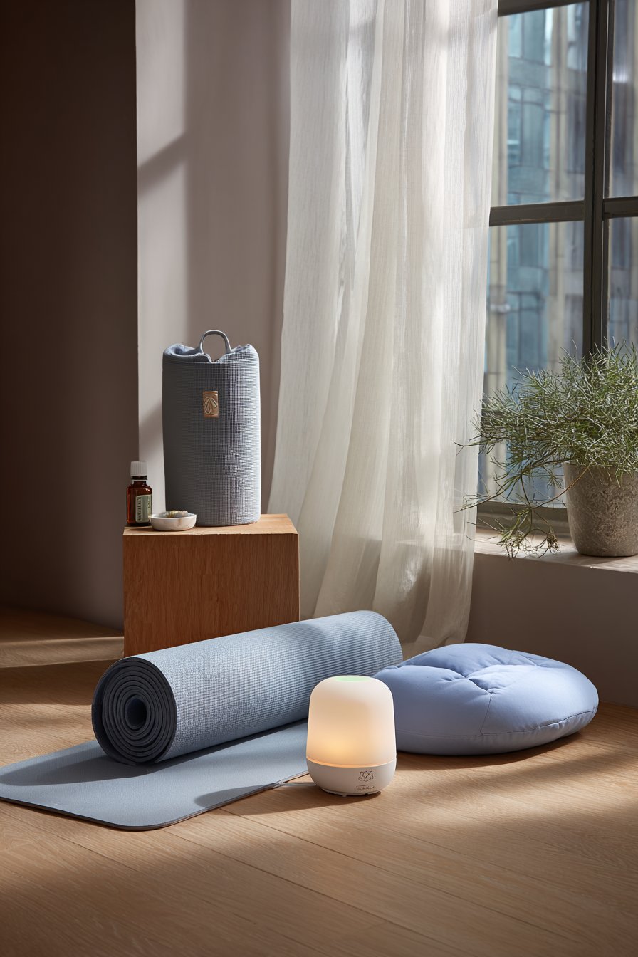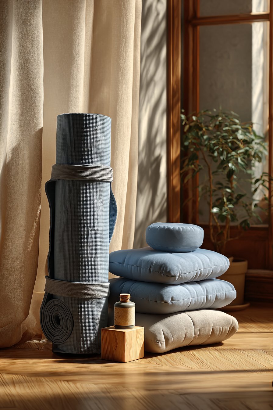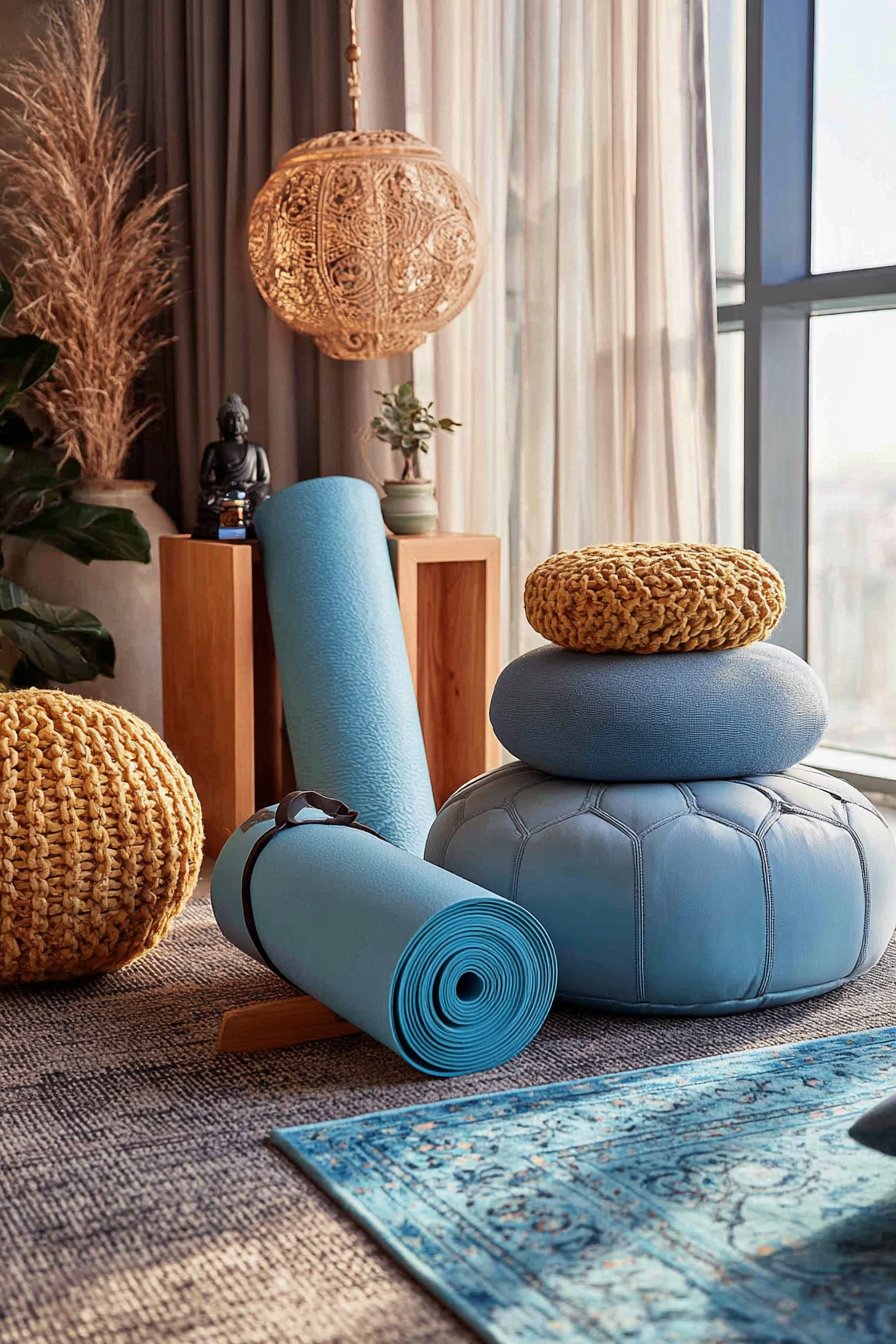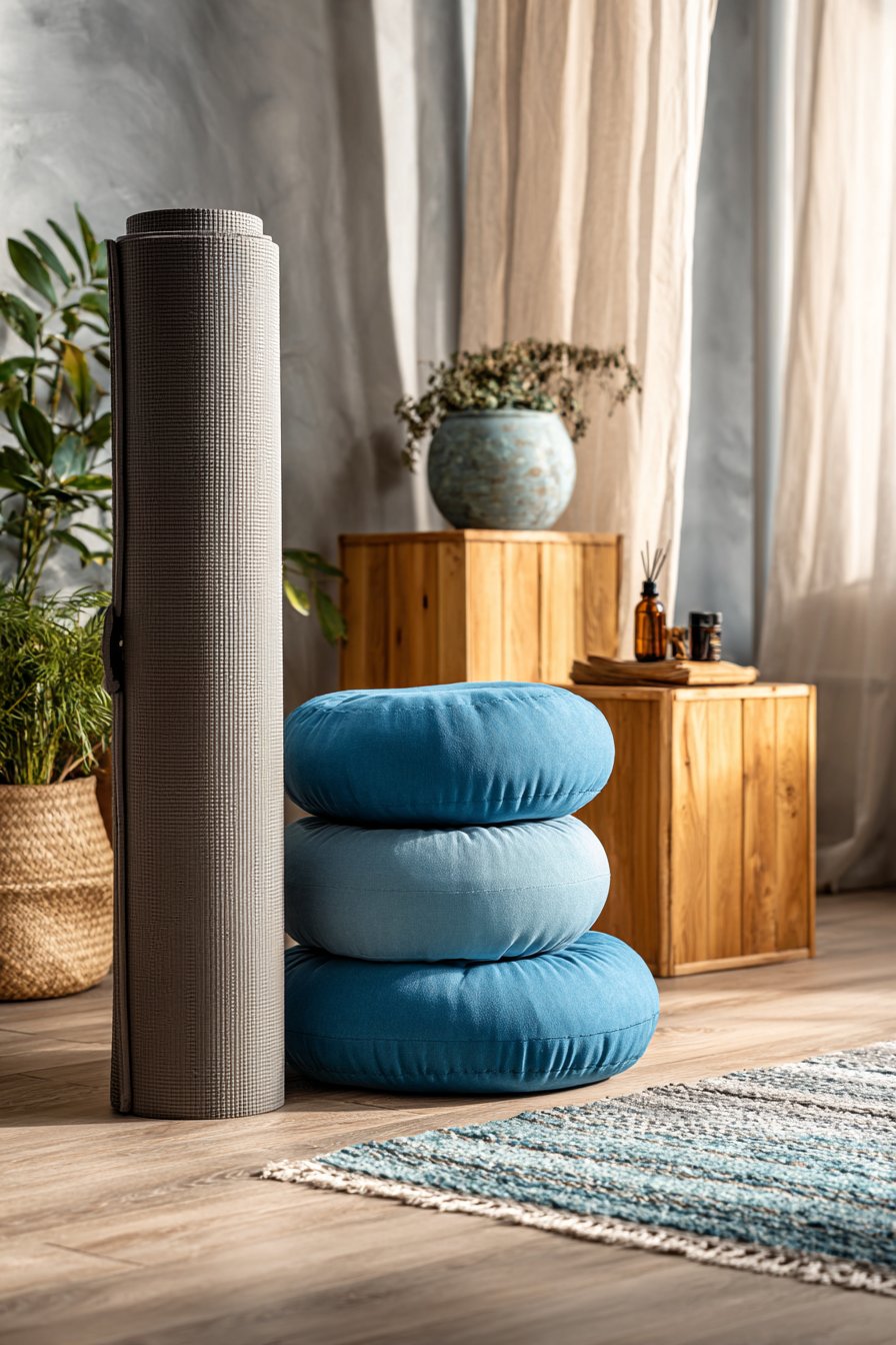 Mental health and self-care have rightfully become priorities, especially for young people navigating the stresses of education, early careers, and independent living. This dedicated wellness corner creates a sanctuary for mindfulness practices, yoga, meditation, and quiet reflection. A vertical yoga mat holder stores your mat compactly when not in use, while meditation cushions in calming blue tones provide comfortable seating for seated meditation or breathwork practices.