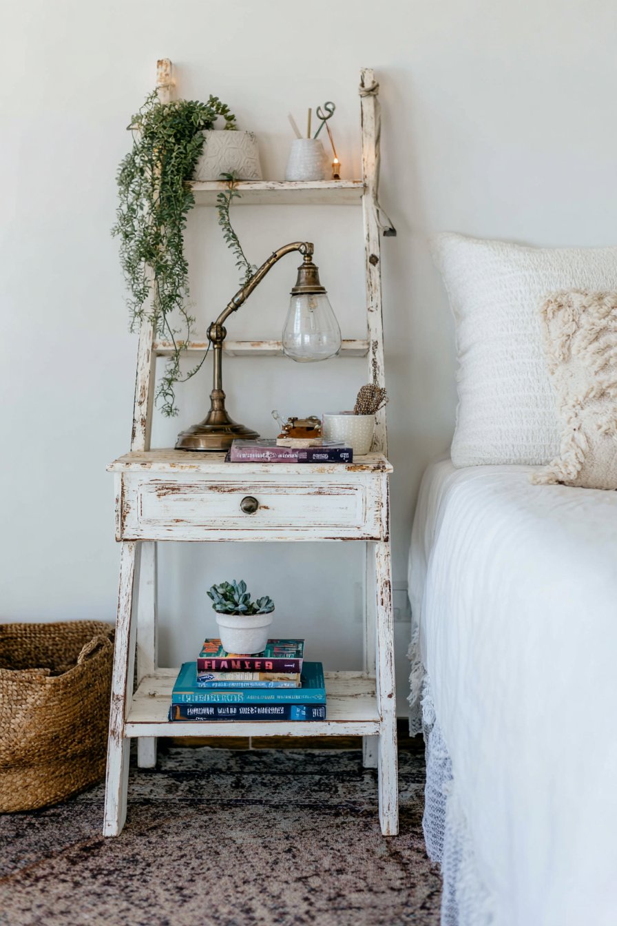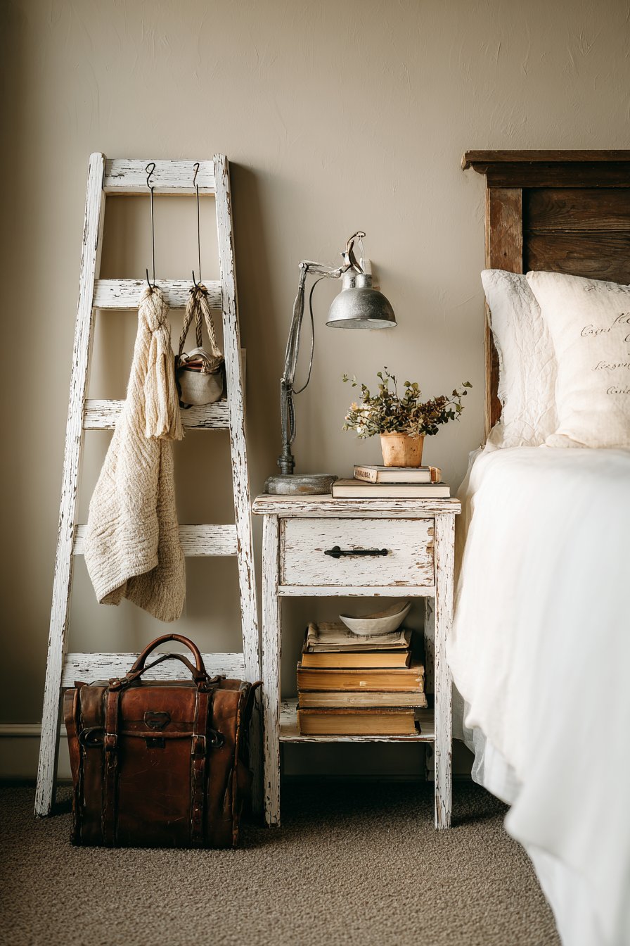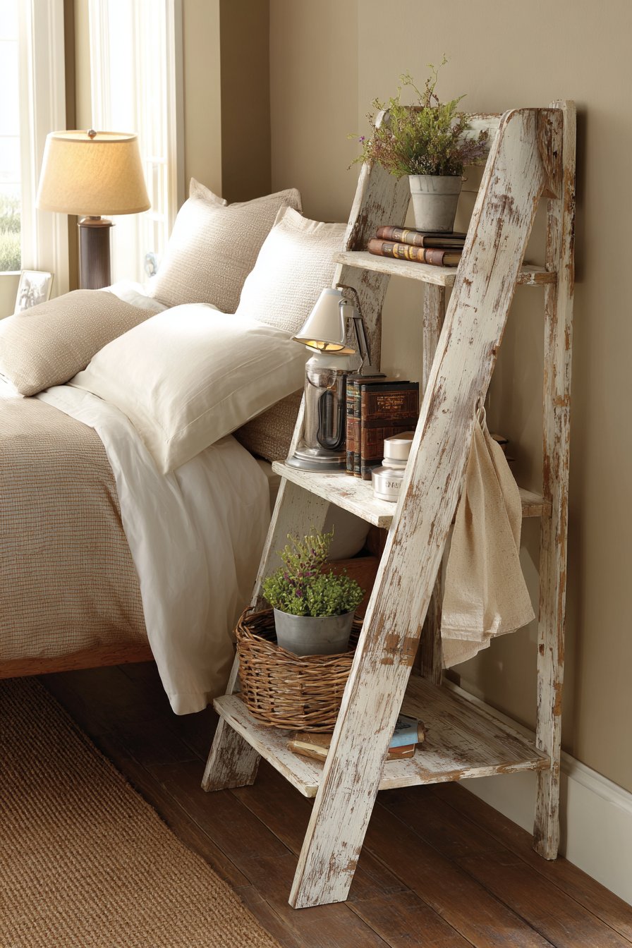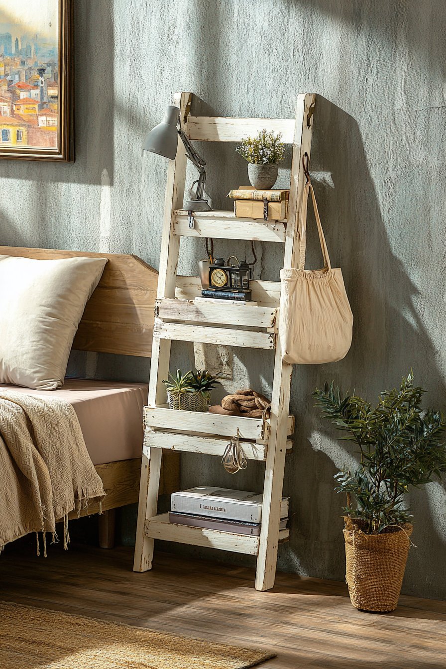 Creative repurposing transforms ordinary objects into unique furniture pieces that add character while solving functional challenges. A vintage wooden ladder leaned against the wall beside your bed becomes an unexpectedly charming nightstand alternative. Each rung holds different items—a reading lamp with a curved arm perched on the bottom rung, books stacked on the middle rungs, and a small potted plant near the top adding greenery at varied heights.