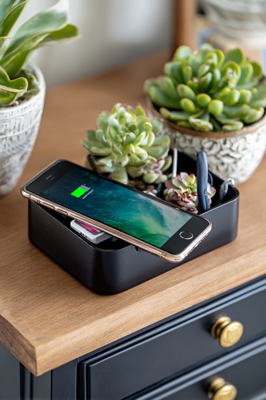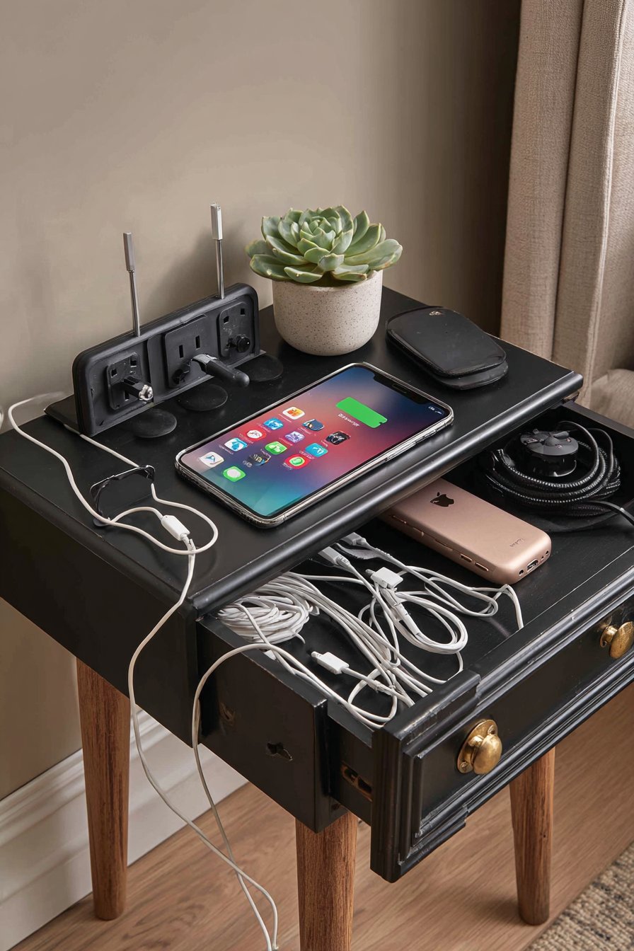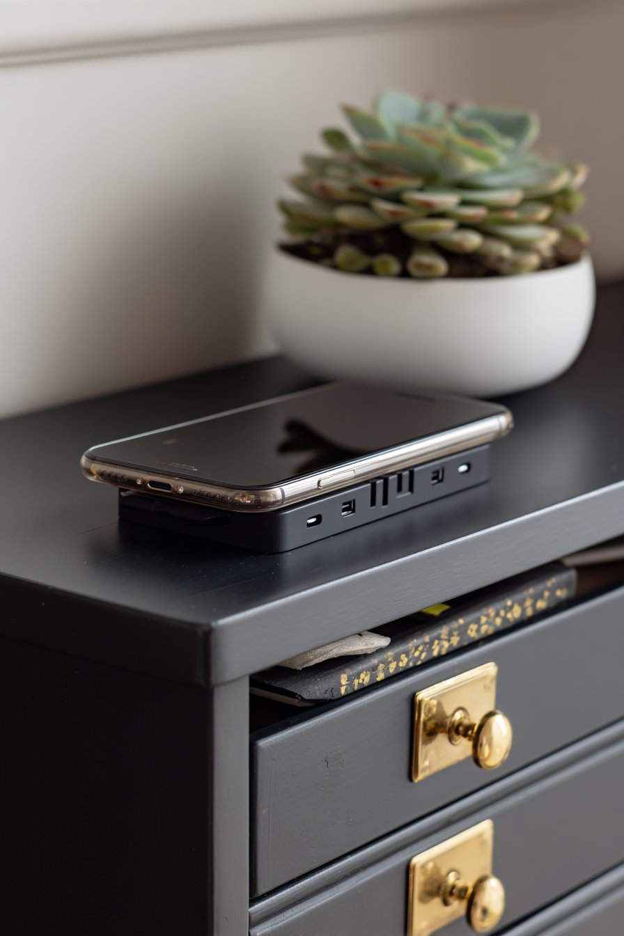The nightstand surface holds a phone stand positioned for optimal viewing angles during charging, while a small succulent adds life without requiring frequent watering. The minimalist styling prevents the tech-focused station from appearing cluttered or industrial. The nightstand painted in matte black with brass drawer pulls creates sophisticated contrast while providing concealed storage for charging cables, adapters, and other tech accessories not currently in use.