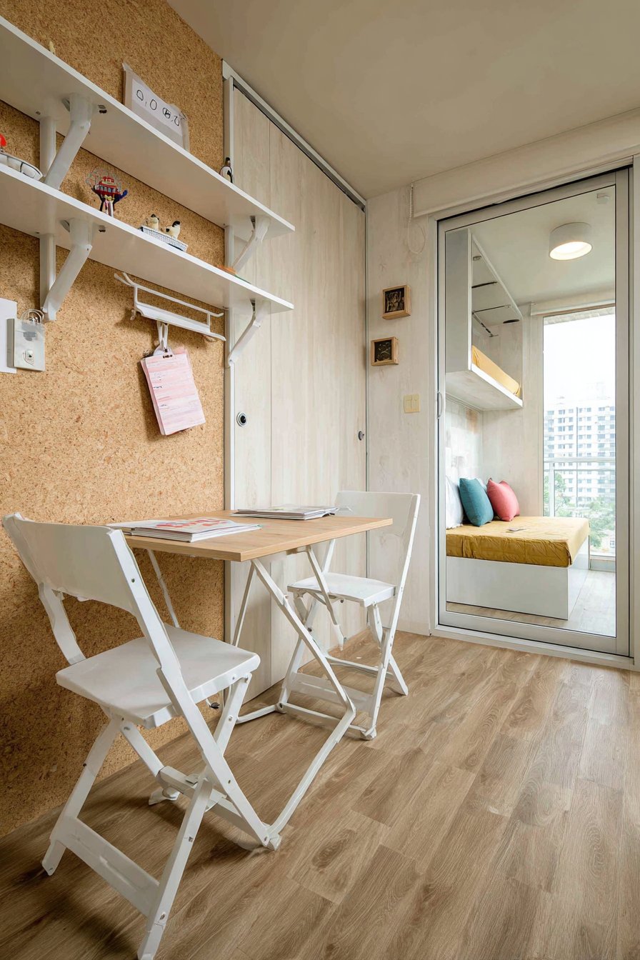 Studio apartments and single-room PG accommodations require furniture that serves multiple functions throughout the day, transforming the space to meet changing needs. This design features a folding wall-mounted desk that stows flat when not in use, folding chairs hung on wall hooks appearing as decorative elements rather than utilitarian storage, and a murphy bed that reveals a small seating area when raised to the upright position.