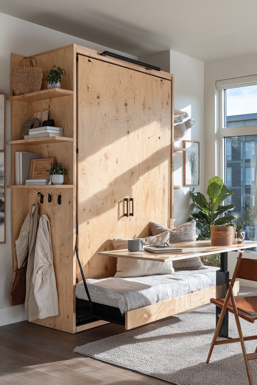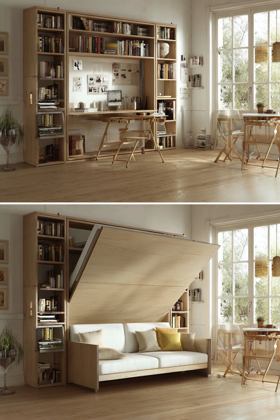 The light wood finishes and white walls create an airy Scandinavian aesthetic that prevents the mechanical elements of transforming furniture from feeling cold or industrial. The multi-functional nature means one room can shift from bedroom to home office to entertaining space throughout a single day. Morning routines might begin with the bed upright and desk deployed for email checking, transition to lowering the bed for an afternoon nap, then finish with the bed raised again to create seating area for evening socializing.