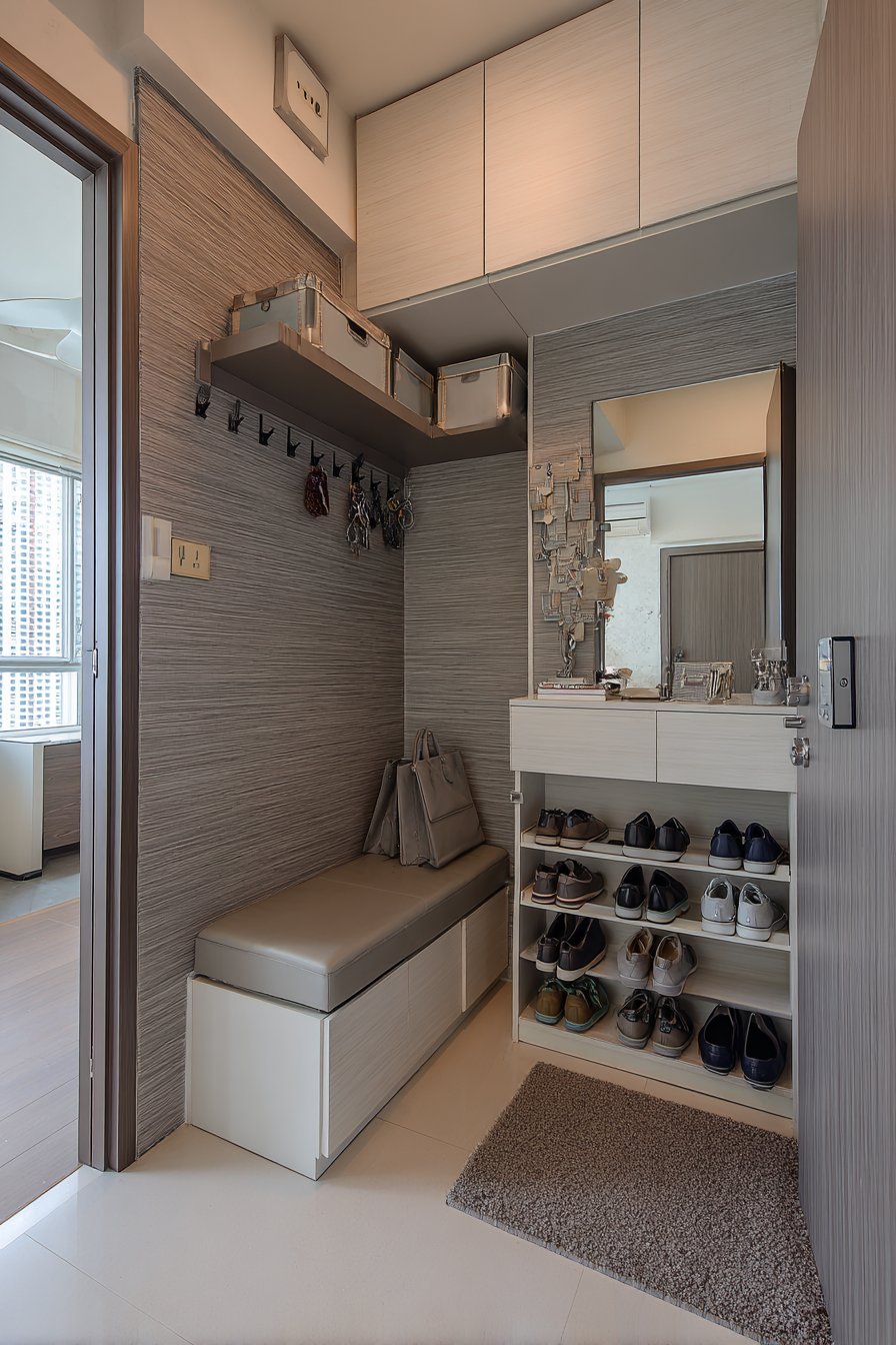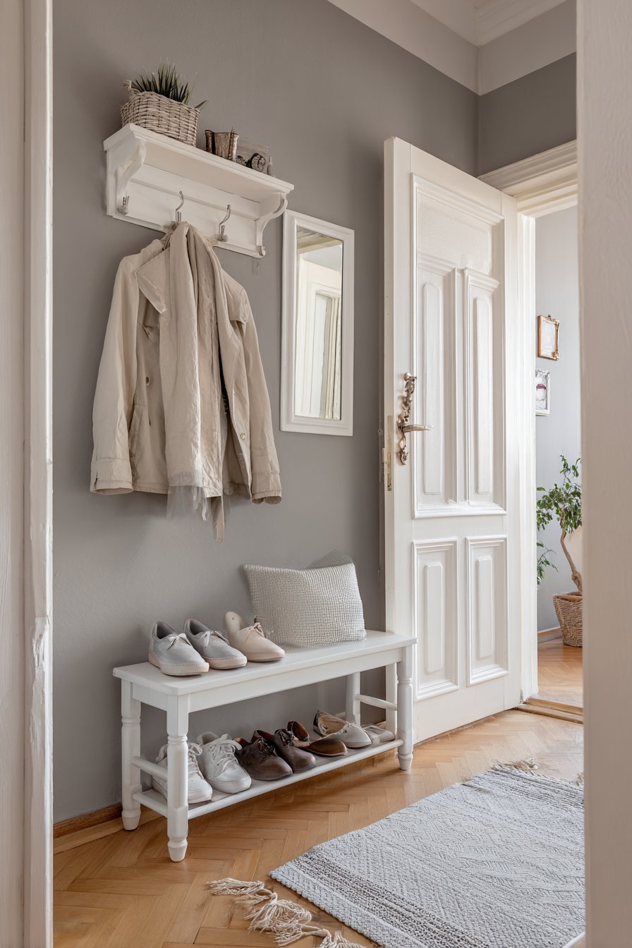 The coordinated grey and white color scheme matches the broader room palette, creating visual flow from entry to interior. This immediate organization system prevents the common problem of dropping items wherever you enter, which quickly creates clutter that spreads throughout the room. Everything has a designated spot immediately inside the door, making both departure preparation and arrival routines significantly smoother.