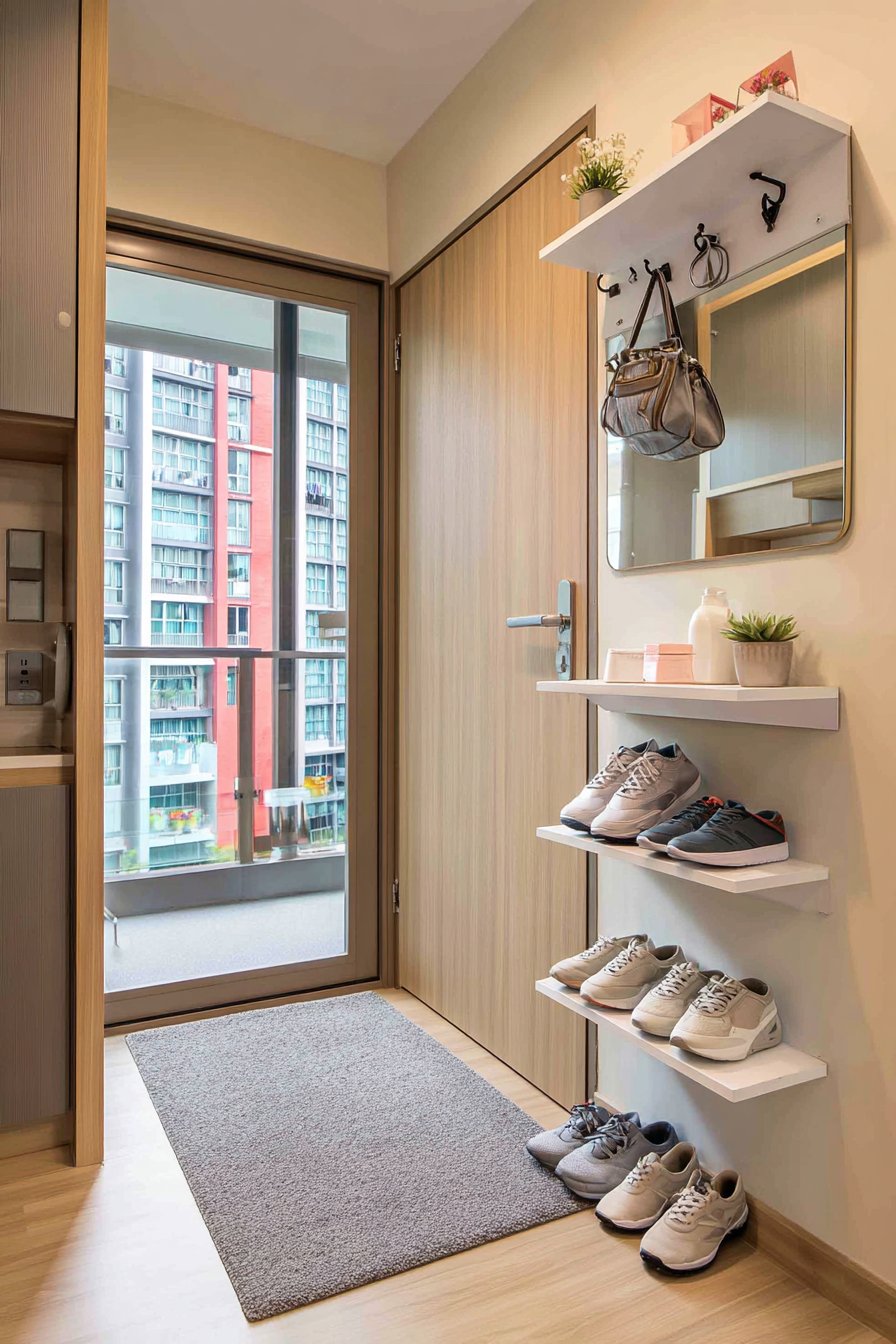 The narrow shoe rack’s vertical design keeps footwear contained without consuming significant floor space, while the higher positioning of hooks and mirrors makes the entry feel taller and more spacious. This organization system particularly benefits PG residents sharing rooms or common spaces, as it maintains clear boundaries between personal items and communal areas while presenting an organized, respectful appearance to roommates.