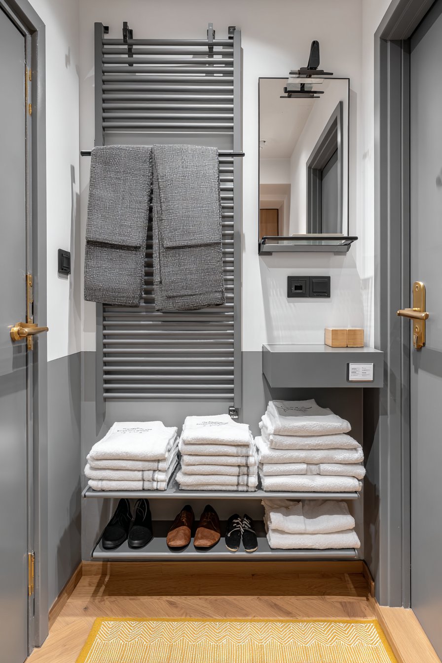 - Add a small step stool nearby if using vertical space for higher hanging rods or upper storage baskets