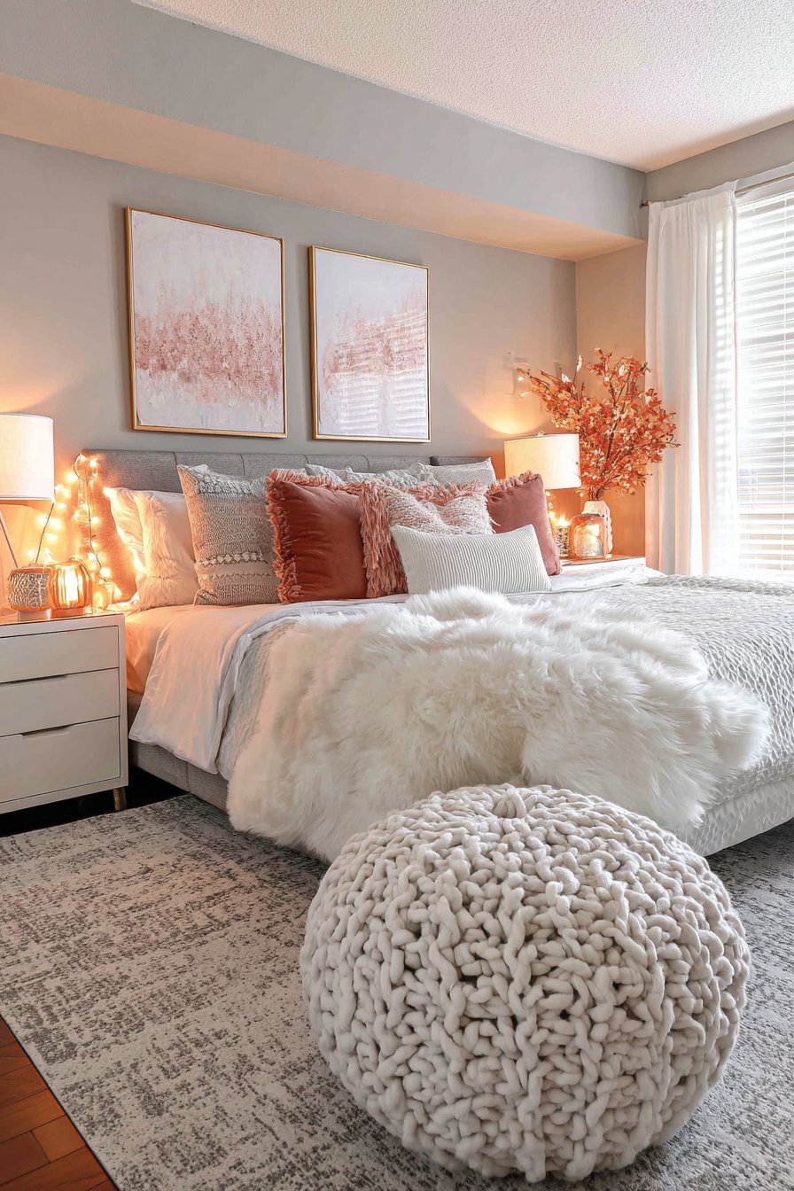 Creating genuine coziness in a PG room requires layering various textures that engage multiple senses and establish warmth beyond simple visual aesthetics. This design embraces tactile richness through a faux fur rug positioned beside the bed where feet first touch floor each morning, velvet throw pillows in jewel tones like emerald, sapphire, and ruby scattered across neutral bedding, and a chunky knit pouf providing extra seating while introducing substantial texture.