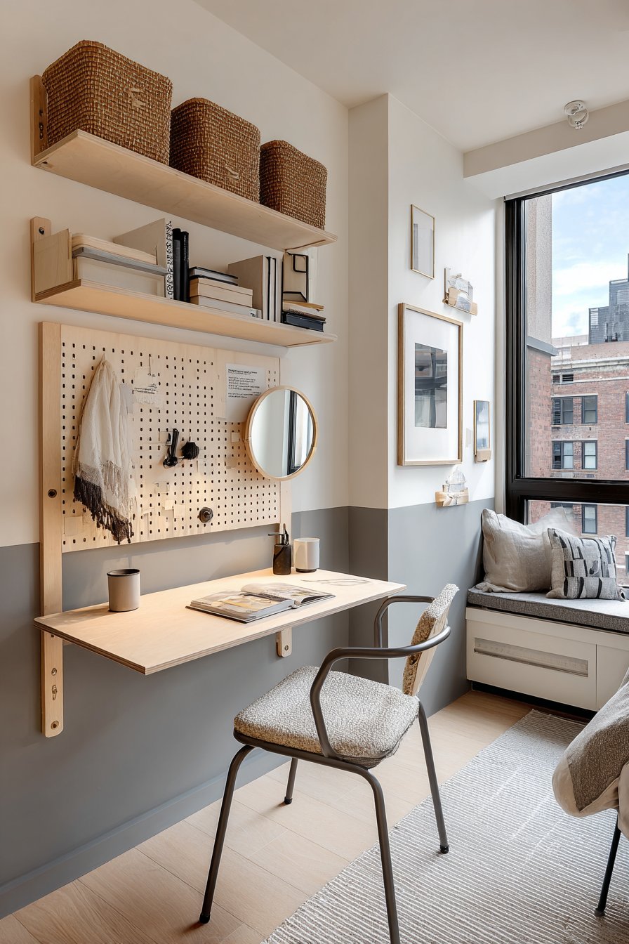 Above the desk, open shelving creates a organized display for academic materials, reference books, and decorative elements. Matching woven baskets on these shelves conceal office supplies, charging cables, and miscellaneous items that would otherwise create visual clutter. The pegboard installation adjacent to the desk serves multiple functions—it holds daily essentials like headphones, a small mirror for quick appearance checks before video calls, keys, and even a small calendar or to-do list. The beauty of pegboard lies in its adaptability; hooks and small shelves can be rearranged as your needs evolve.