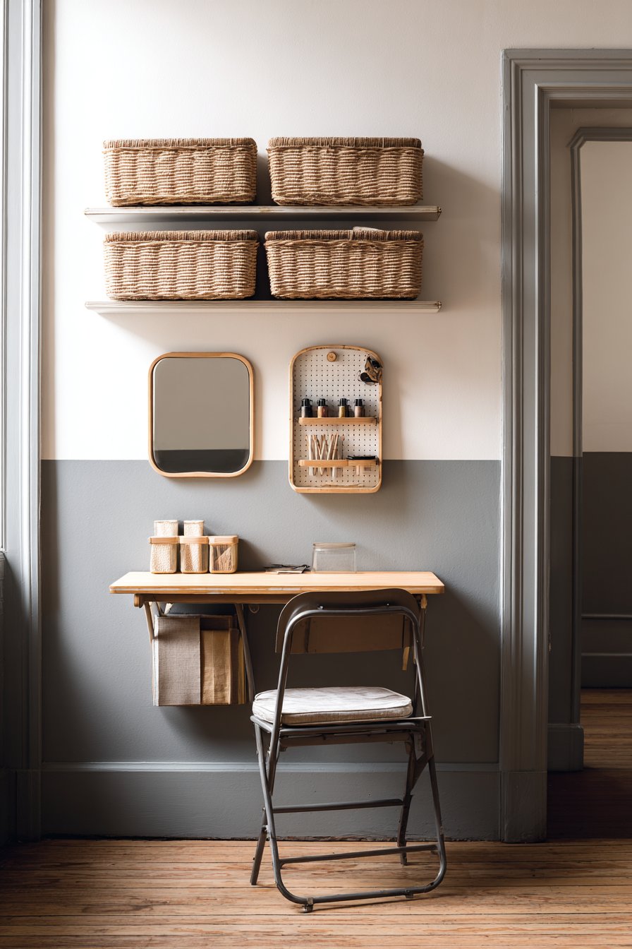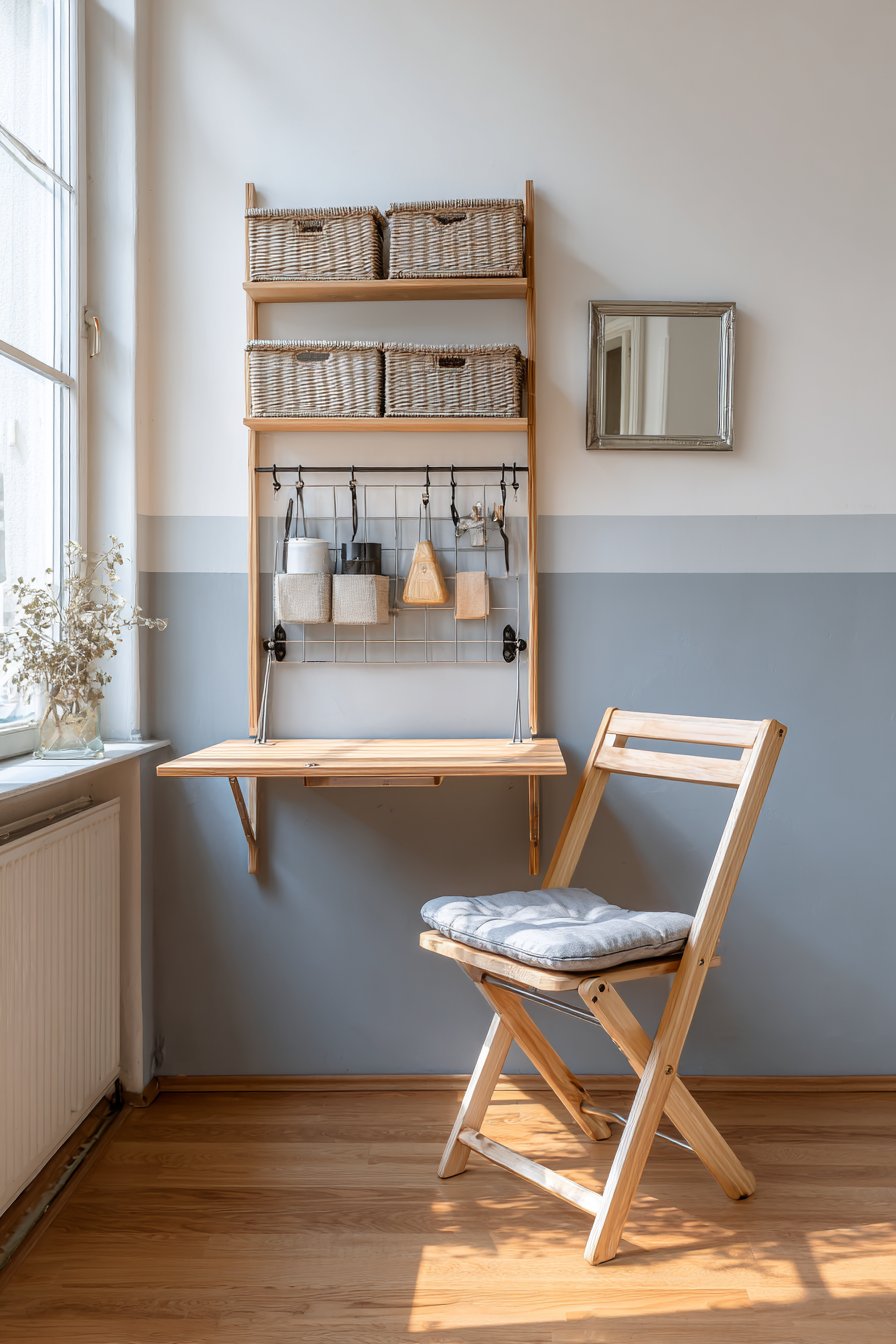 The two-tone paint scheme divides the wall horizontally, with grey covering the lower portion and crisp white above the desk area. This visual technique grounds the workspace while preventing the walls from feeling too stark or clinical. The simple metal chair with a cushioned seat can be tucked completely under the desk when folded up, maintaining clear pathways in the room. Natural window light illuminates the workspace during daytime hours, reducing reliance on artificial lighting and creating an energizing environment for productivity.