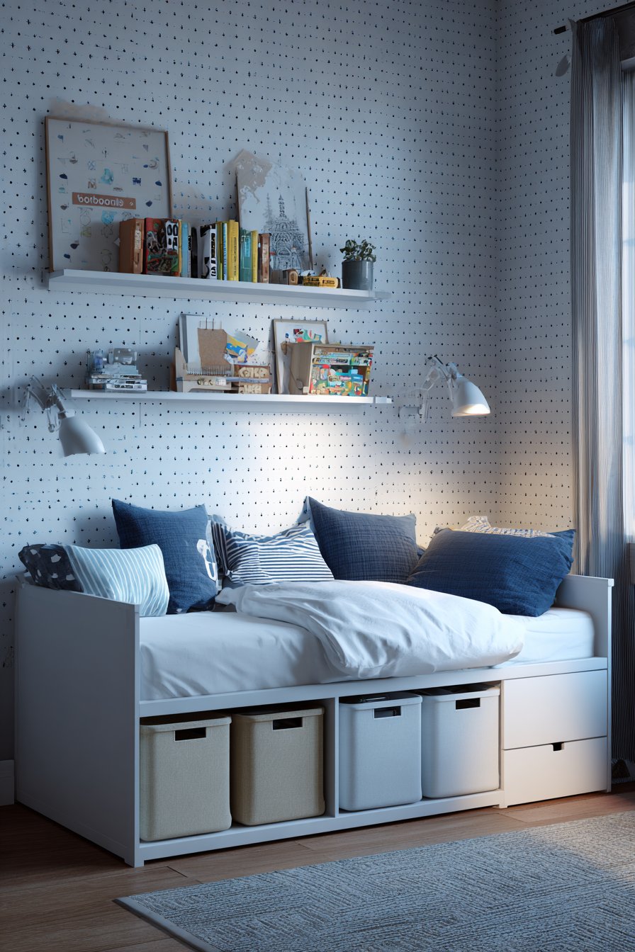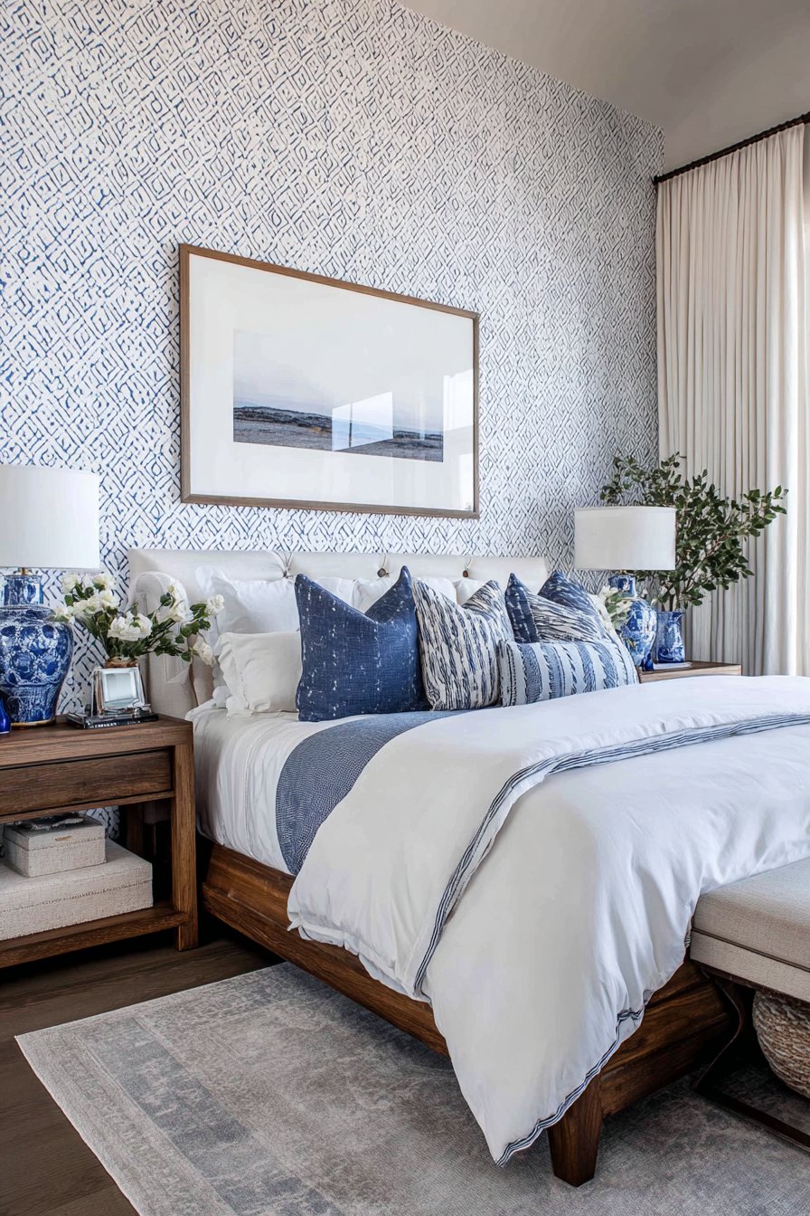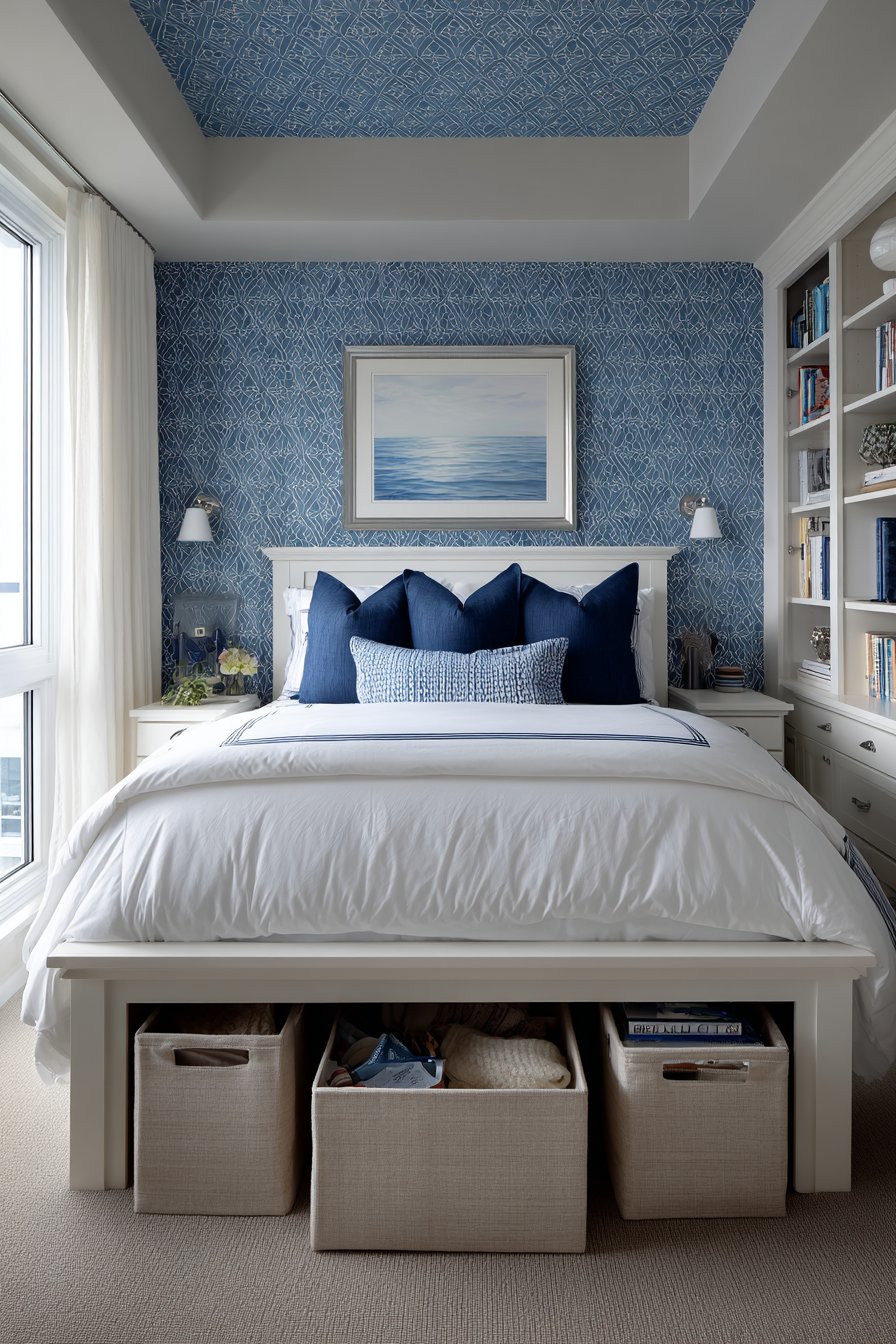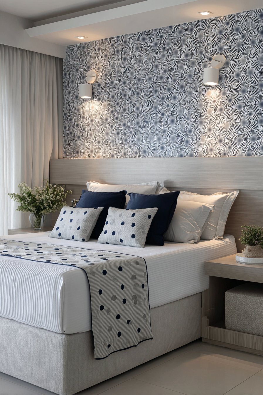 The headboard wall becomes a statement feature with removable peel-and-stick wallpaper in a subtle geometric pattern combining navy blue and white. This contemporary design adds visual interest and depth without overwhelming the space, and its removable nature means you can change the look as trends evolve or when moving out without losing your security deposit. The coordinating bedding—crisp white duvet with navy accent pillows—creates a hotel-like freshness that makes crawling into bed at the end of a long day feel truly restorative.