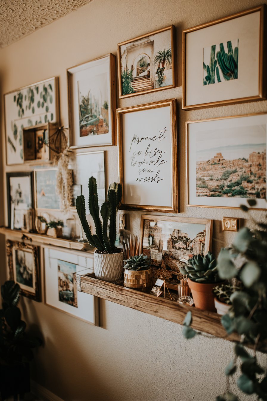 A frame shelf mounted below the main gallery grouping adds dimensional variety and provides space for three-dimensional objects like small potted succulents, decorative figurines, travel souvenirs, or a small clock. This ledge breaks up the flat wall surface and creates opportunities for seasonal updates or thematic displays without requiring new nail holes. The arrangement follows the principle of asymmetrical balance, where larger frames anchor the composition while smaller pieces fill gaps, creating an organic, unplanned appearance despite careful planning.