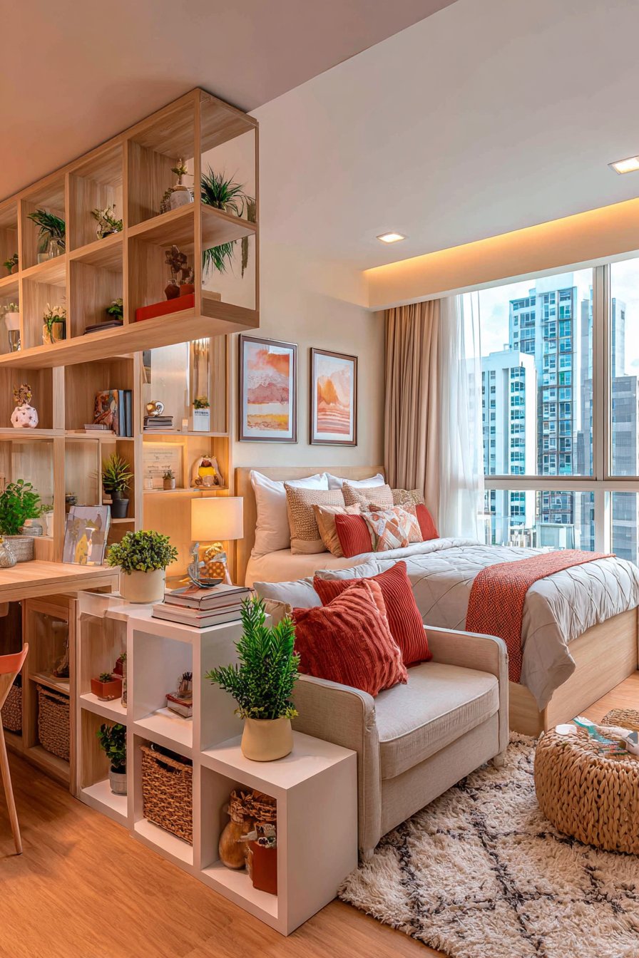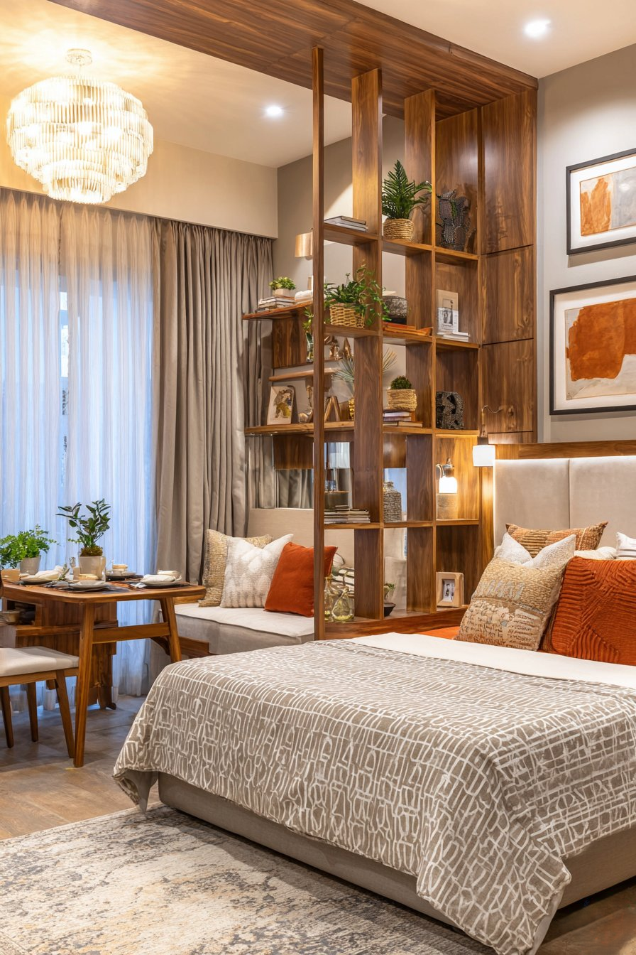 The divider itself becomes a functional and decorative element, styled with books arranged both vertically and horizontally, interspersed with small plants that thrive in indirect light, decorative baskets holding miscellaneous items, and perhaps a few meaningful objects that spark joy. Both sides of the divider are accessible and styled, ensuring the arrangement looks intentional from every angle. The coordinating neutral color palette with strategic pops of terracotta creates cohesion between the separated zones, maintaining visual flow while still distinguishing distinct purposes for each area.