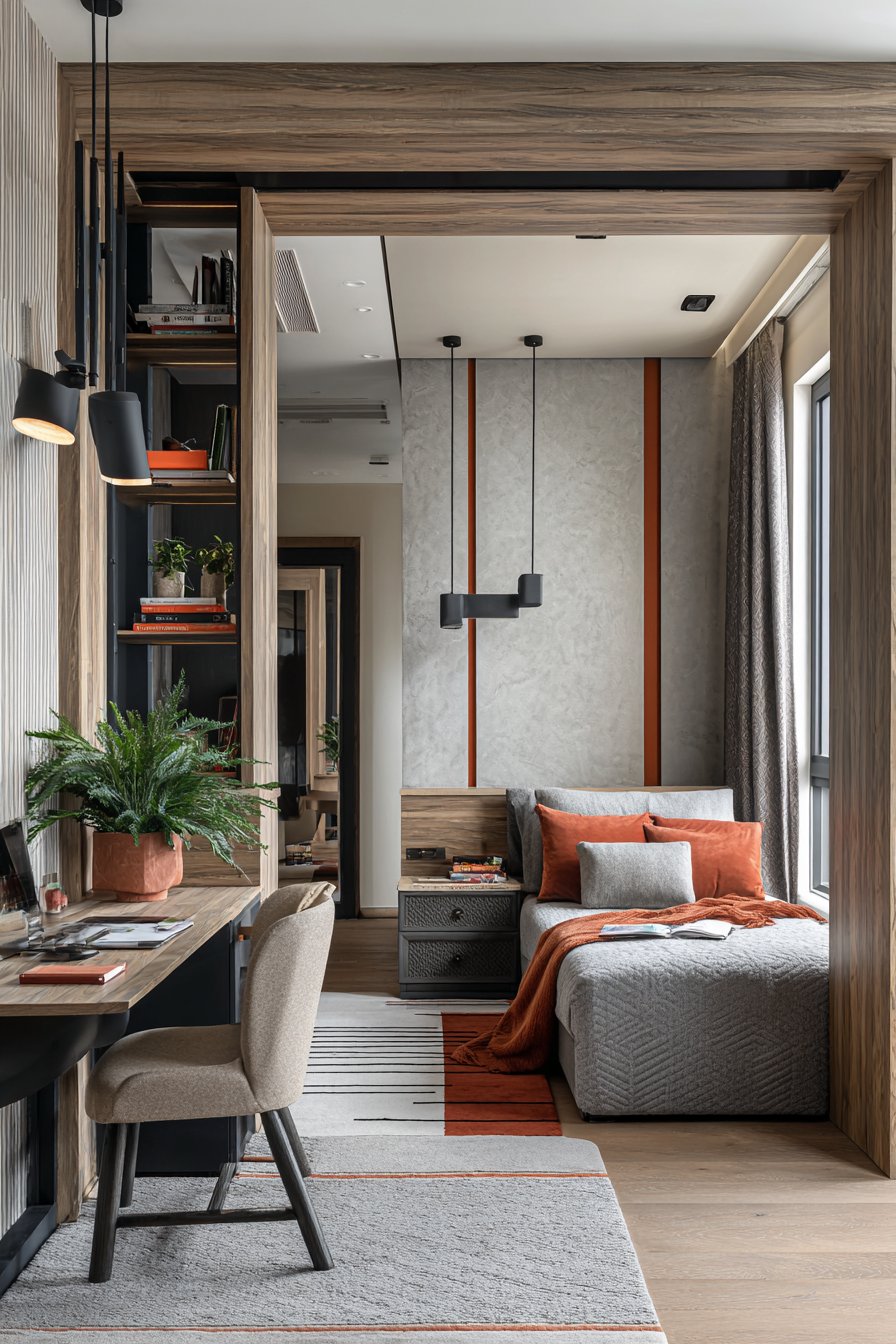 Natural light plays a crucial role in this design, with jute curtains filtering morning sunlight to create a gentle, productive atmosphere. A small pothos or snake plant on the desk introduces a touch of nature, improving air quality and adding visual interest. The beauty of this setup lies in its ability to completely separate sleeping and working zones within a single room, providing psychological boundaries that help maintain work-life balance even in limited quarters.