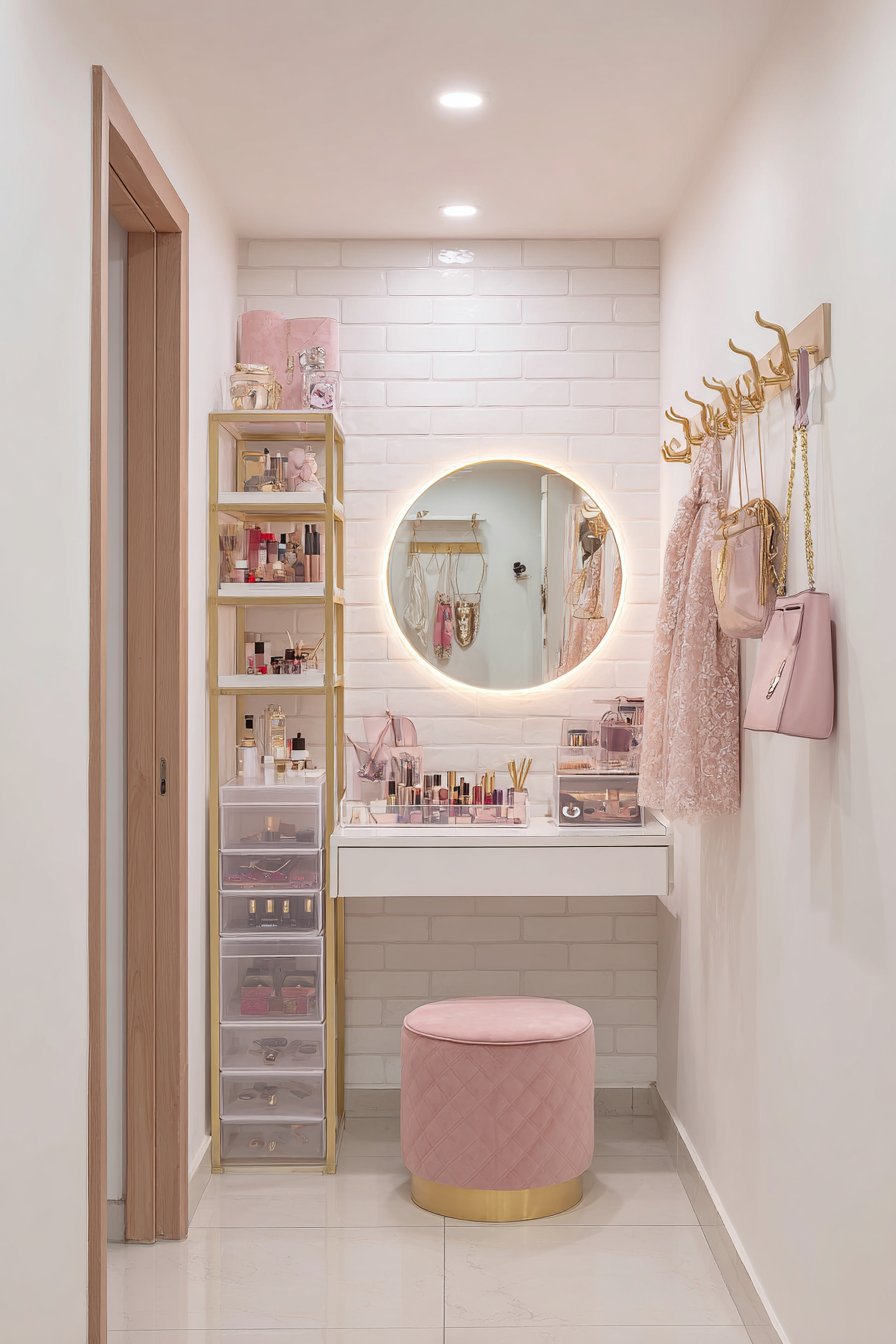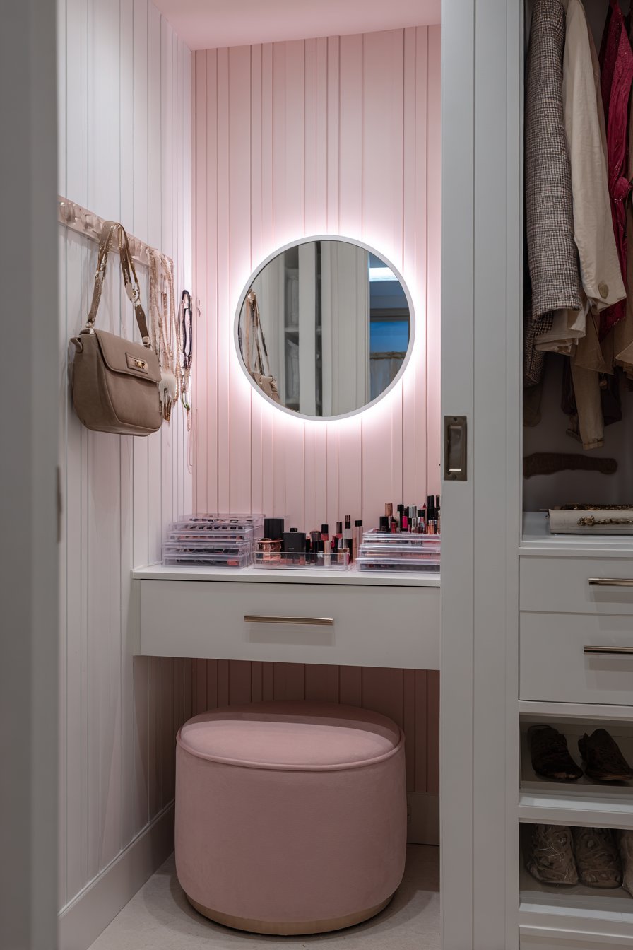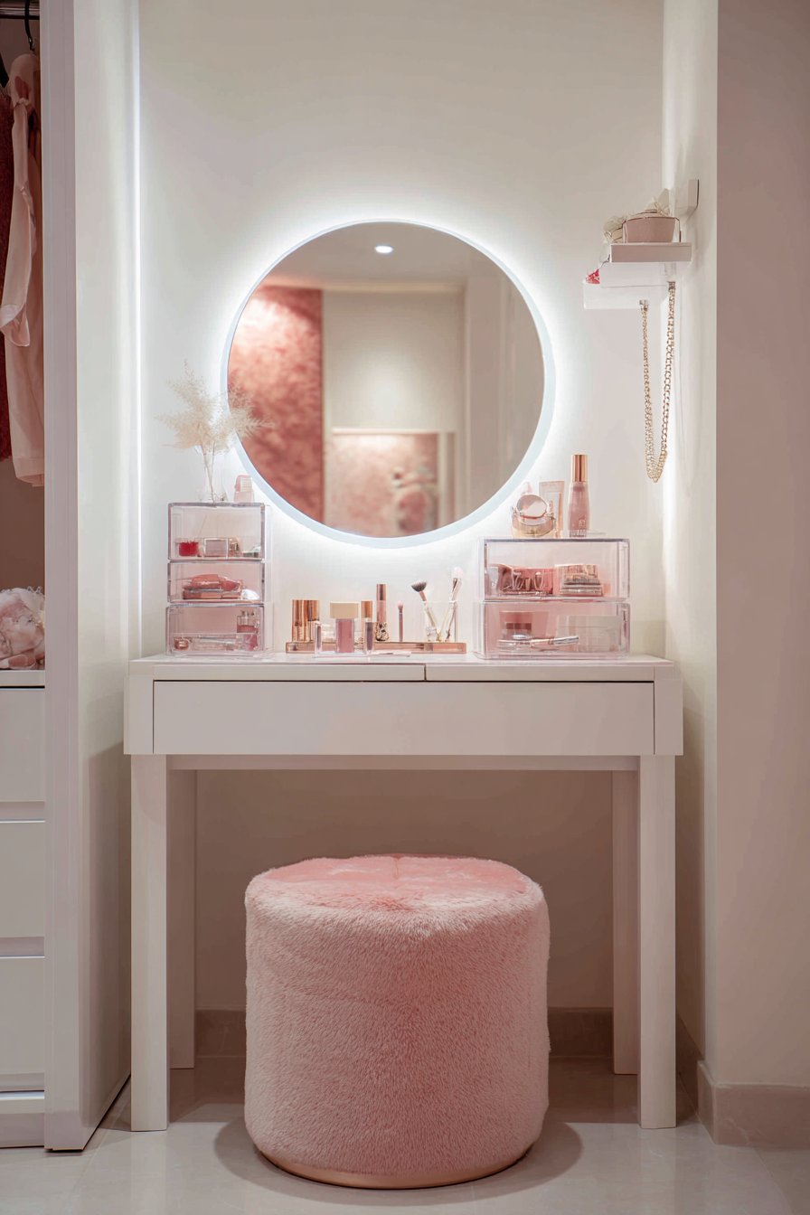 The soft pink accent elements—perhaps through a cushioned stool, a small vase with flowers, or decorative containers—add gentle personality against the clean white walls without overwhelming the compact area. This touch of color creates a dedicated feminine retreat within the larger room, establishing a corner that feels special and intentionally designed for self-care rituals. The cushioned stool tucks completely under the vanity when not in use, maintaining clear floor space for movement.