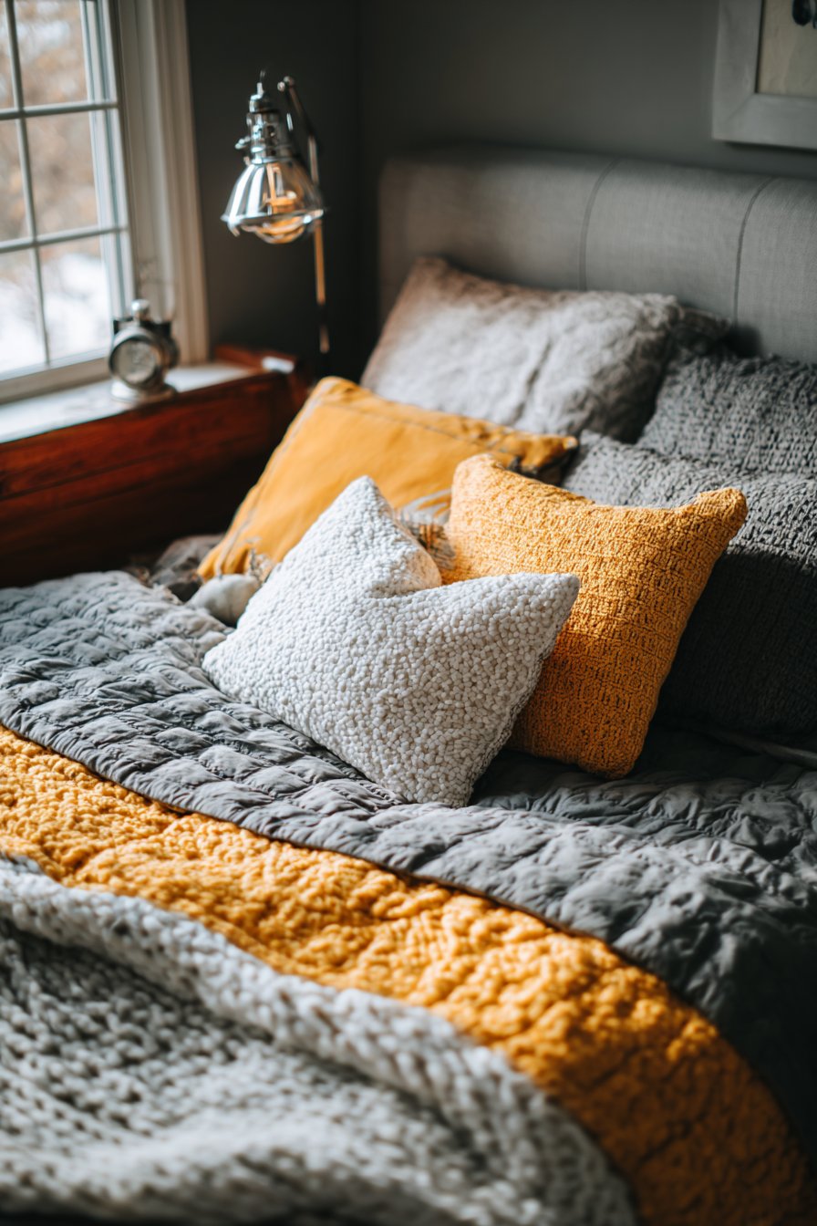 The bed often occupies the largest visual footprint in a PG room, making its styling critically important to the overall aesthetic. This approach to bed dressing embraces the principle of layering multiple textures to create depth, warmth, and visual interest. The foundation begins with a quilted bedspread in sophisticated grey, providing subtle pattern and dimension. Decorative pillows in mustard yellow and crisp white introduce color contrast that energizes the neutral base while remaining sophisticated and versatile.