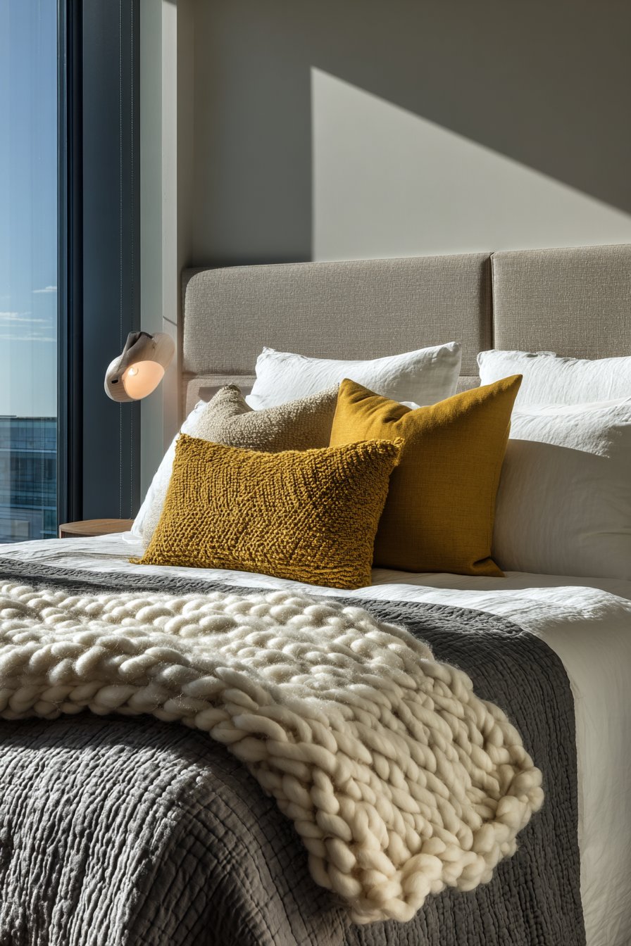 The chunky knit throw blanket positioned at the foot of the bed serves multiple purposes—it adds another textural layer, provides warmth for cool evenings, and creates a polished, “made bed” appearance even when the rest of the bedding isn’t perfectly arranged. The fabric-covered foam panels creating the headboard offer a soft, upholstered look without the expense or permanence of traditional upholstered furniture. These panels can be created with foam board from craft stores, wrapped in neutral fabric, and mounted to the wall with removable adhesive strips.
