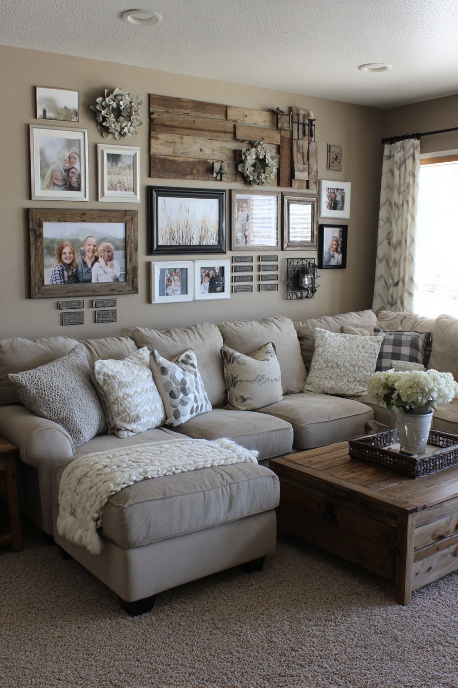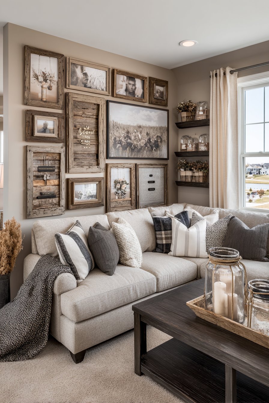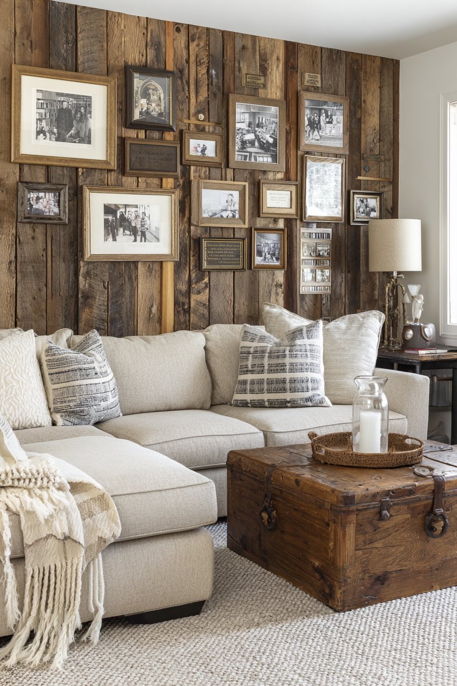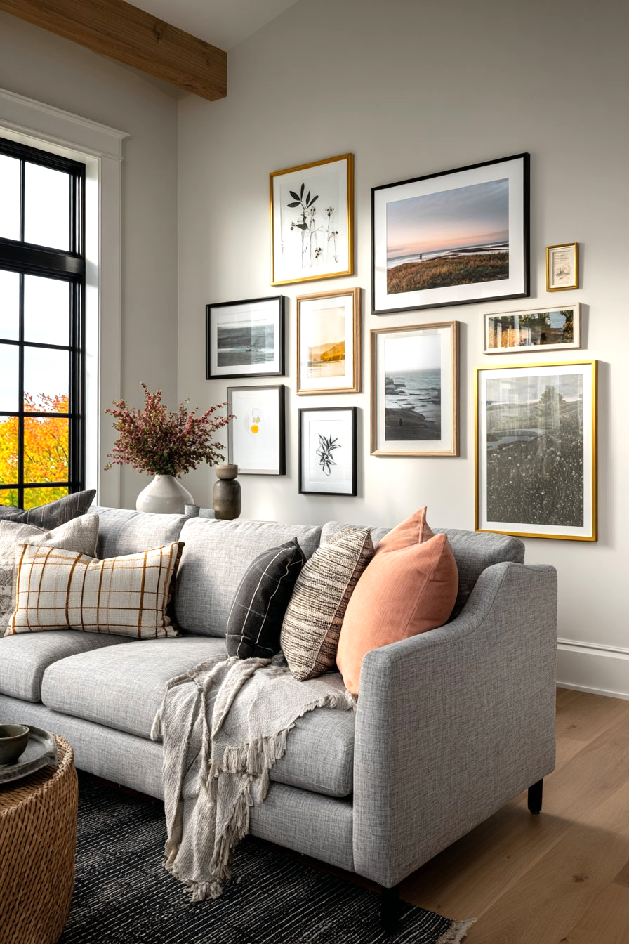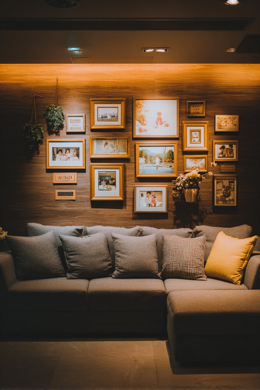 Sentimental and storytelling approaches to gallery walls create emotional resonance that purely aesthetic displays cannot match. This family timeline wall arranges frames in coordinating natural wood finishes chronologically from left to right, documenting family milestones through photographs and memorabilia. Small plaques beneath select frames note significant dates and events—births, weddings, graduations, anniversaries—transforming the wall into an interactive family history lesson. The arrangement spans eight feet horizontally at eye level, perfect viewing distance from the comfortable sectional sofa positioned to face the display.