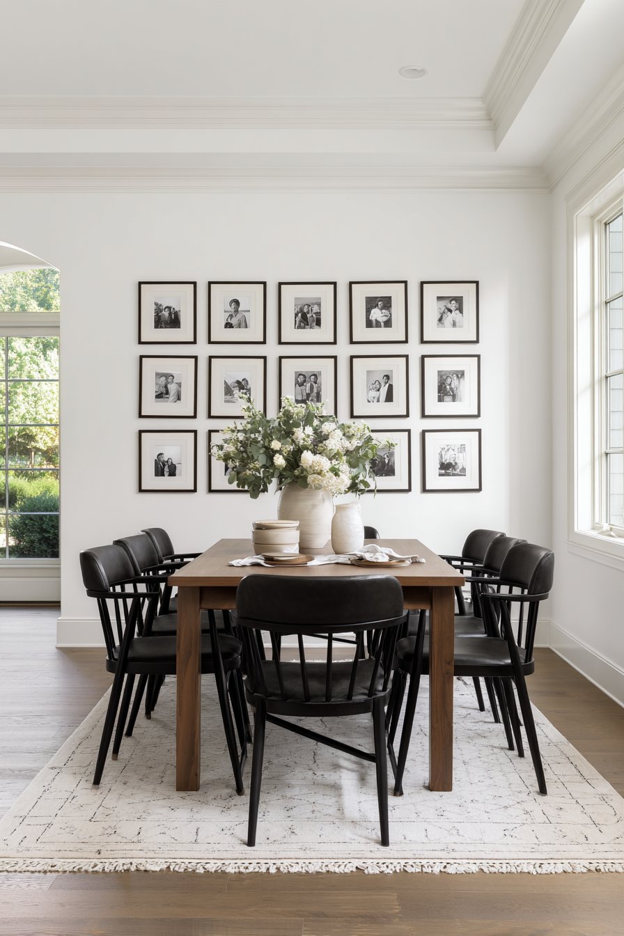 The dining room setting for this particular arrangement makes perfect sense—it creates a conversation starter during meals and provides visual interest without overwhelming the space. The contrast between the warm walnut tones of the dining table and the crisp black and white palette of the frames creates a sophisticated tension that elevates both elements. For those concerned about the stark nature of monochrome, the varied subjects within the photographs provide subtle tonal variations that prevent the display from feeling too severe.