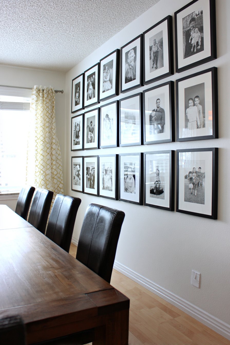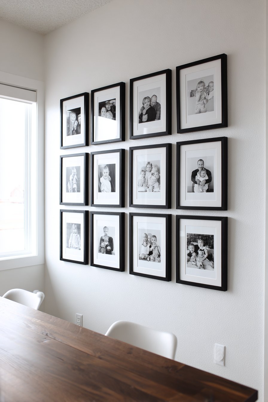 The symmetrical grid arrangement represents the epitome of organized elegance in picture wall design. This approach features twelve identically-sized black frames arranged in perfect rows and columns, creating a harmonious display that appeals to those who appreciate balance and order. The monochromatic black and white family photographs within each frame create a cohesive narrative while the precise spacing—typically two inches between frames—ensures visual rhythm that’s pleasing to the eye. When positioned above a modern walnut dining table, this arrangement bridges the gap between contemporary furniture and timeless photography, creating a focal point that’s both personal and sophisticated.