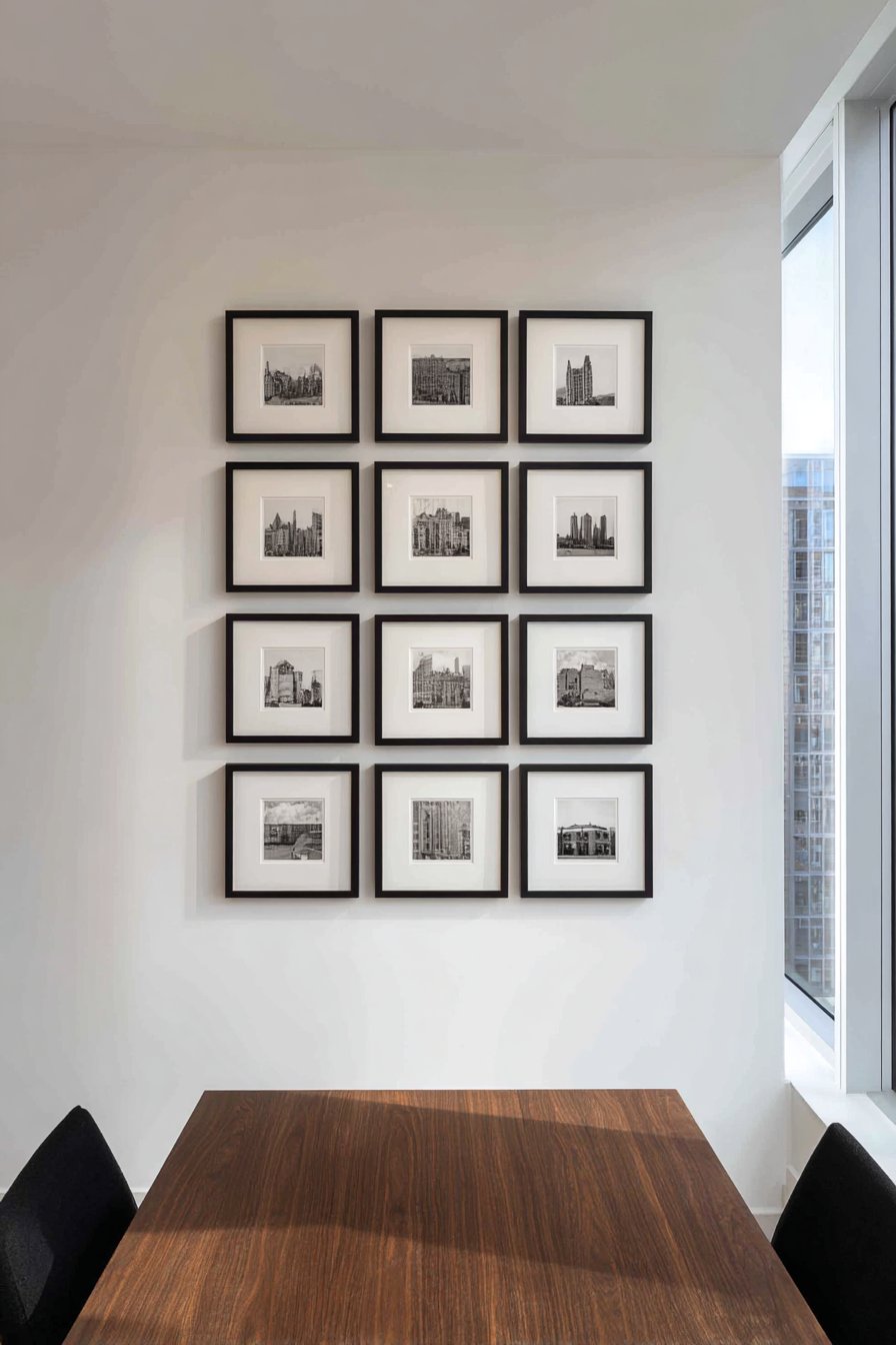 Key Design Tips: Choose frames with identical dimensions, preferably 12×12 inches, to maintain perfect symmetry. Use a level and measuring tape to ensure precise spacing—consistency is crucial for this style. Convert all photographs to black and white during editing to maintain visual cohesion, even if they were originally taken in different settings or time periods. Consider the viewing distance from your dining table when determining frame size and height placement. Mount the arrangement so the center point aligns with eye level when seated for optimal viewing during meals.