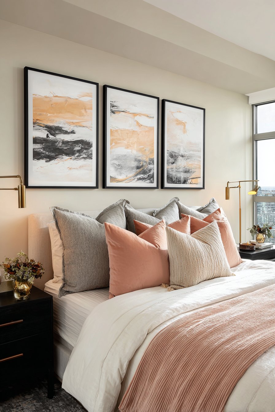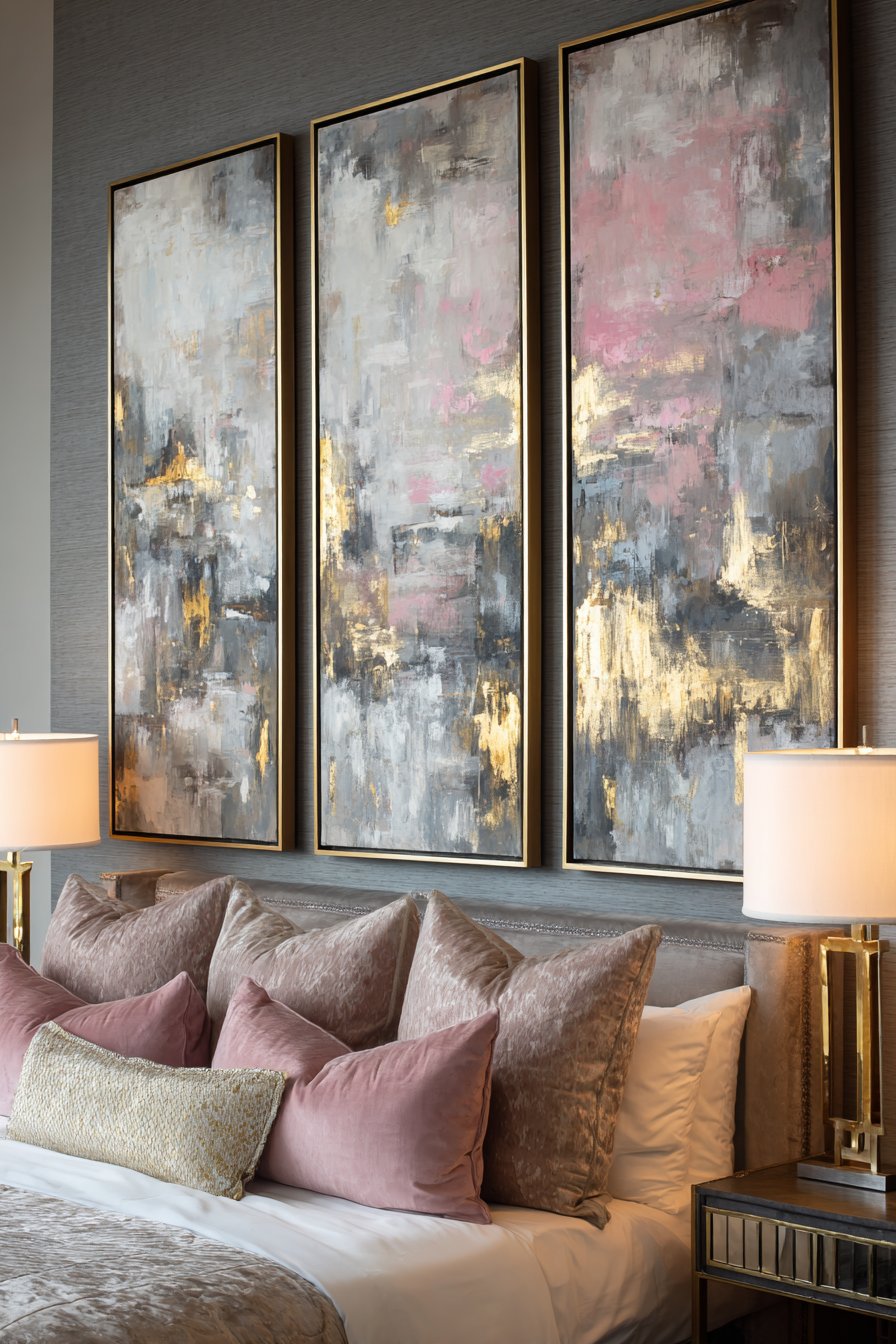 The relationship between the artwork’s palette and the bedding creates a cohesive design story. The gray tones ground the composition, the blush adds warmth and softness appropriate for a bedroom setting, and the gold accents provide just enough glamour without veering into excessive opulence. Bedside lamps provide soft accent lighting that can be adjusted to highlight the texture of the brushstrokes in the evening hours, transforming the artwork from daytime focal point to nighttime ambiance enhancer.