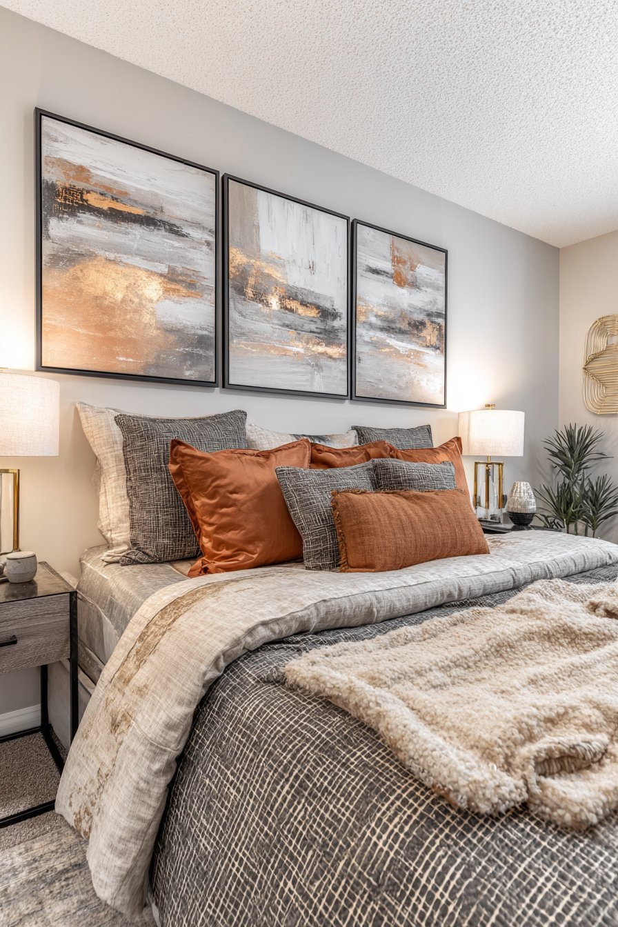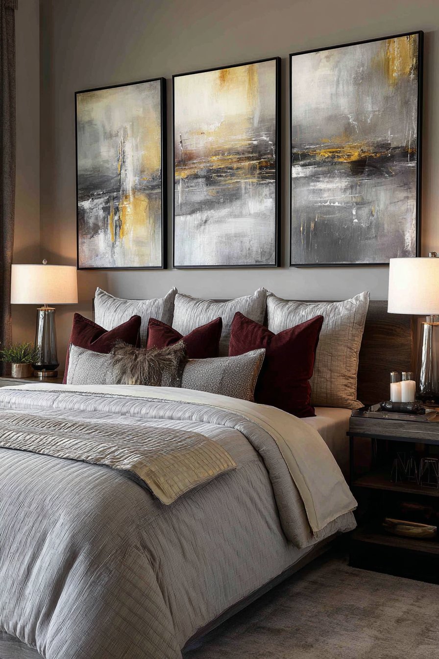 The triptych format—three panels forming a unified composition—has classical roots but feels entirely contemporary when executed with abstract artwork and modern framing. The horizontal orientation emphasizes the width of the wall behind the bed, making the room feel more spacious and luxurious. The spacing between the three panels creates negative space that prevents the large-scale art from feeling overwhelming, while the coordinated color palette ensures the separate pieces read as an intentional set rather than random selections placed side by side.