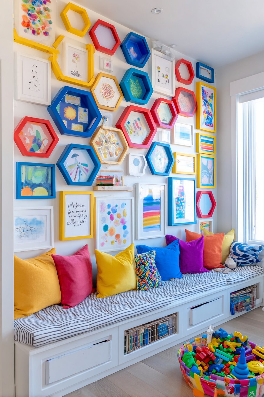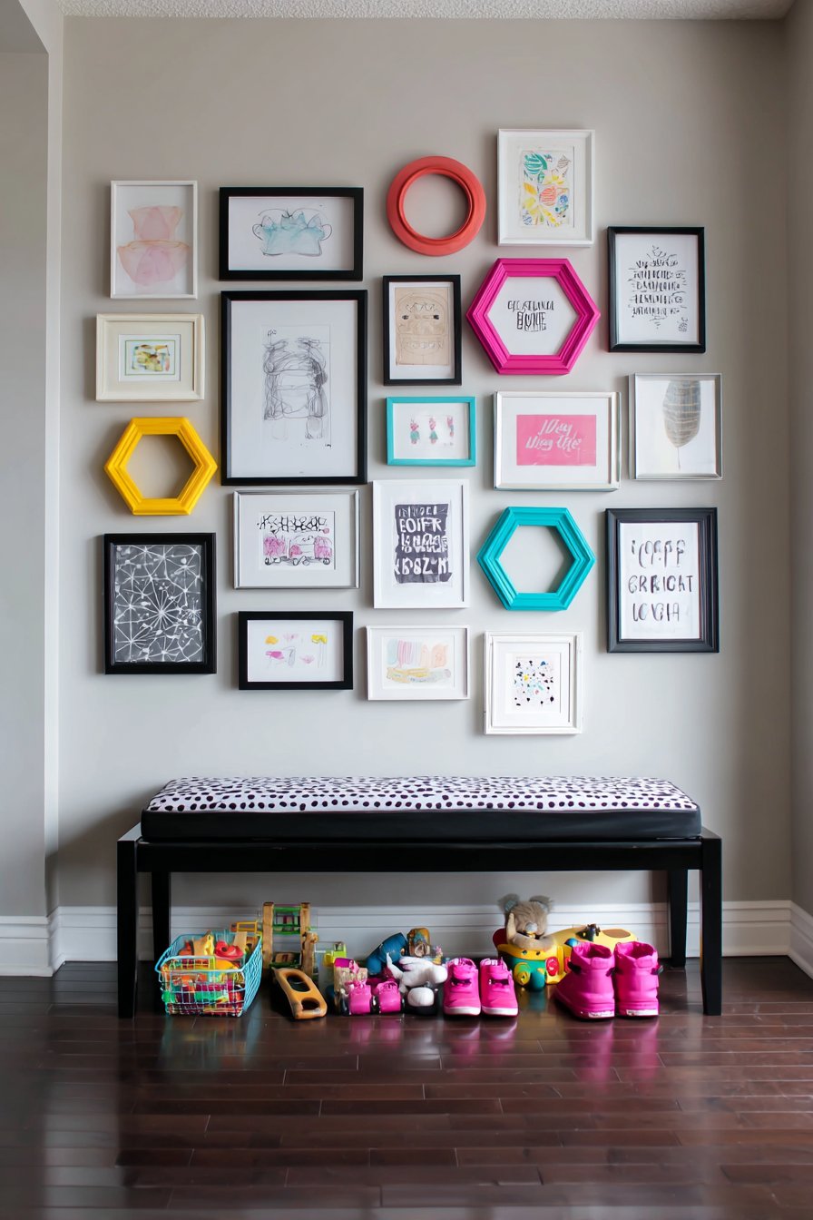 The genius of this approach lies in its celebration of childhood creativity without condescension. Rather than relegating children’s artwork to refrigerator magnets or drawer storage, this dedicated gallery wall treats their creations with the same respect adults give to fine art collections. The bright frame colors coordinate with typical playroom palettes while adding graphic punch that energizes the space. The varied frame shapes introduce geometric interest and play that appeals to young minds developing spatial awareness and pattern recognition.
