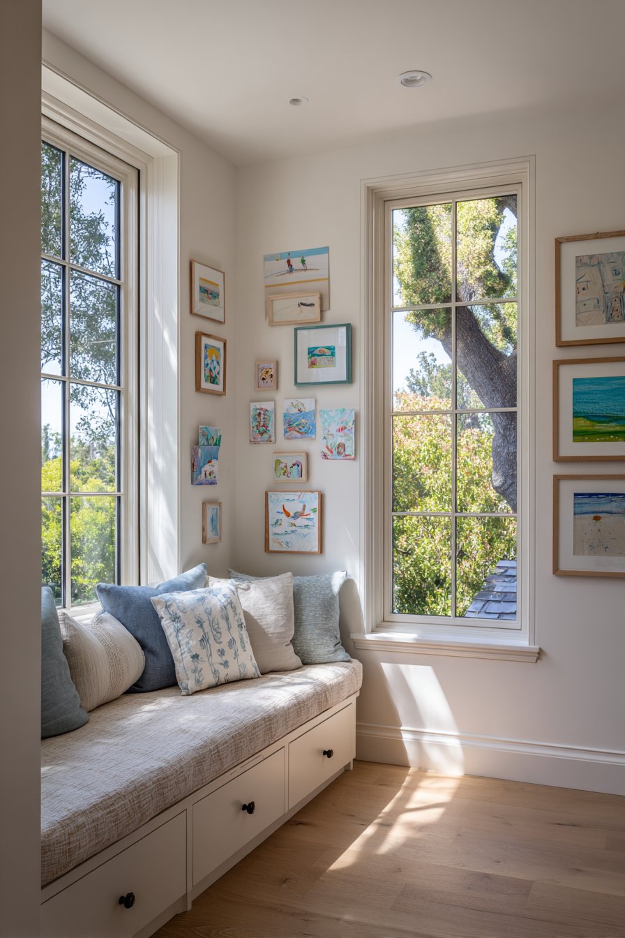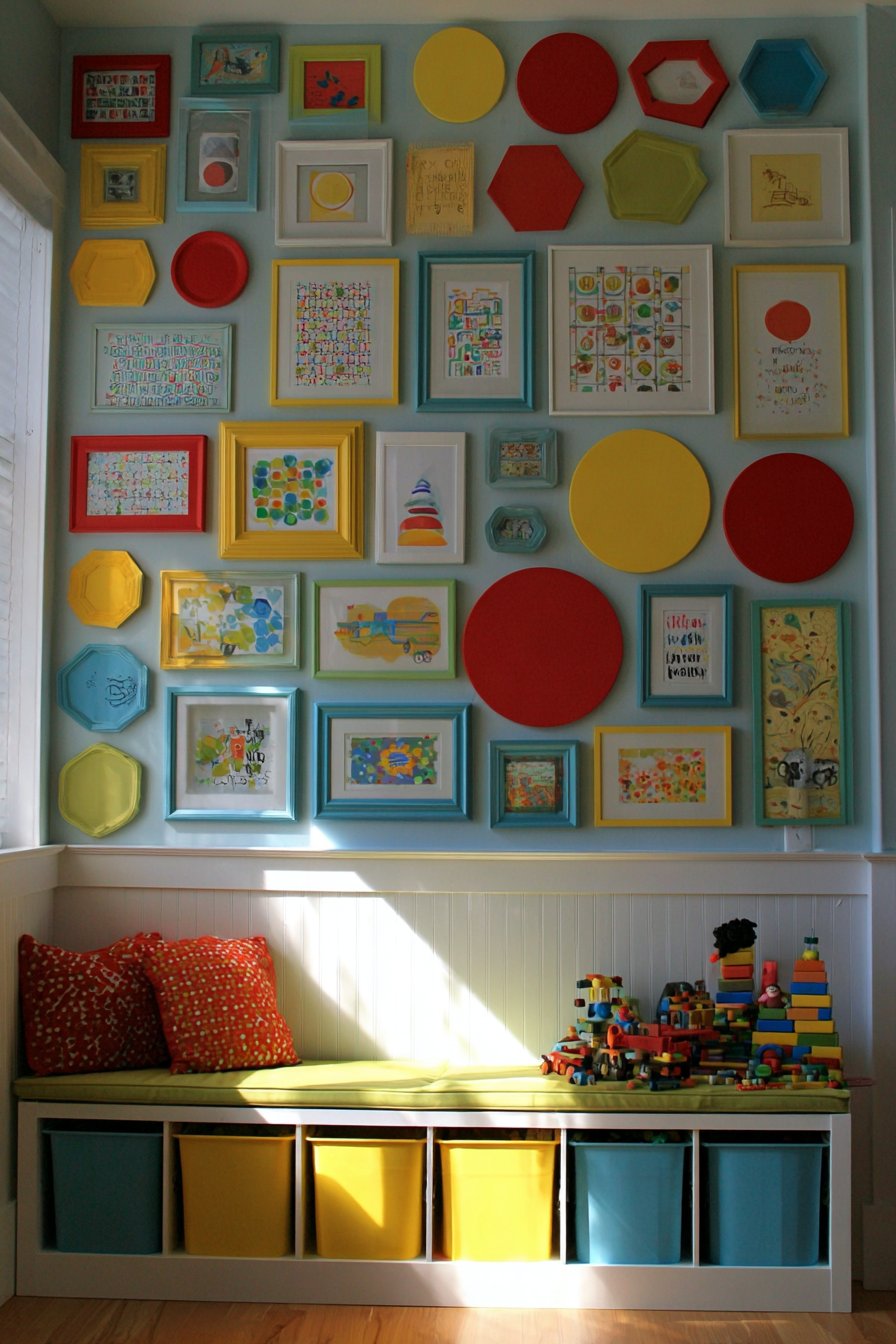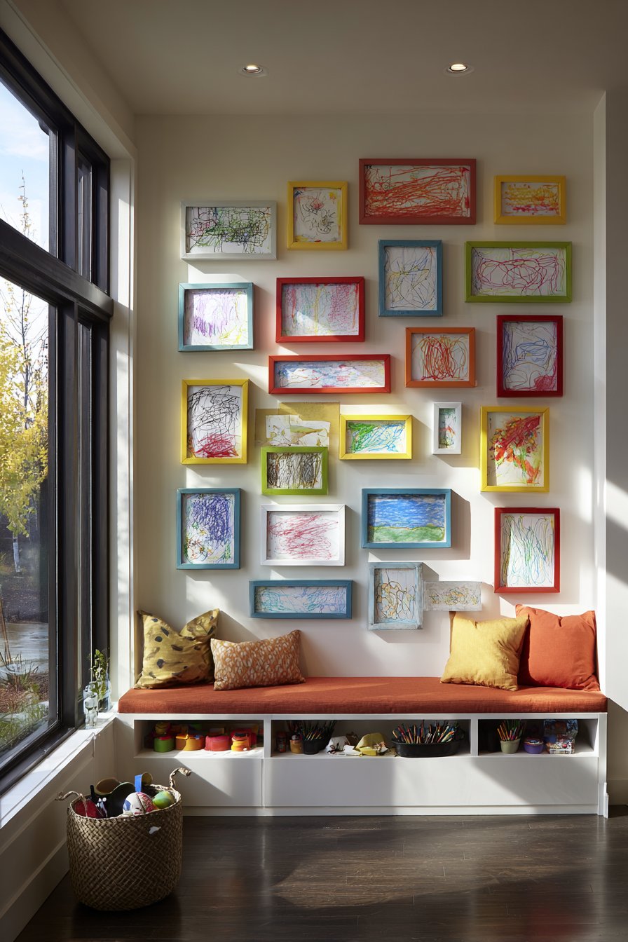 The low storage bench positioned below serves dual purposes—practical toy storage and a functional platform for children to stand on when changing out artwork or simply admiring their displayed creations. Bright natural lighting keeps the space feeling cheerful and active rather than dark or enclosed. The entire design communicates that creativity is valued, encouraging continued artistic expression and building confidence in young creators.