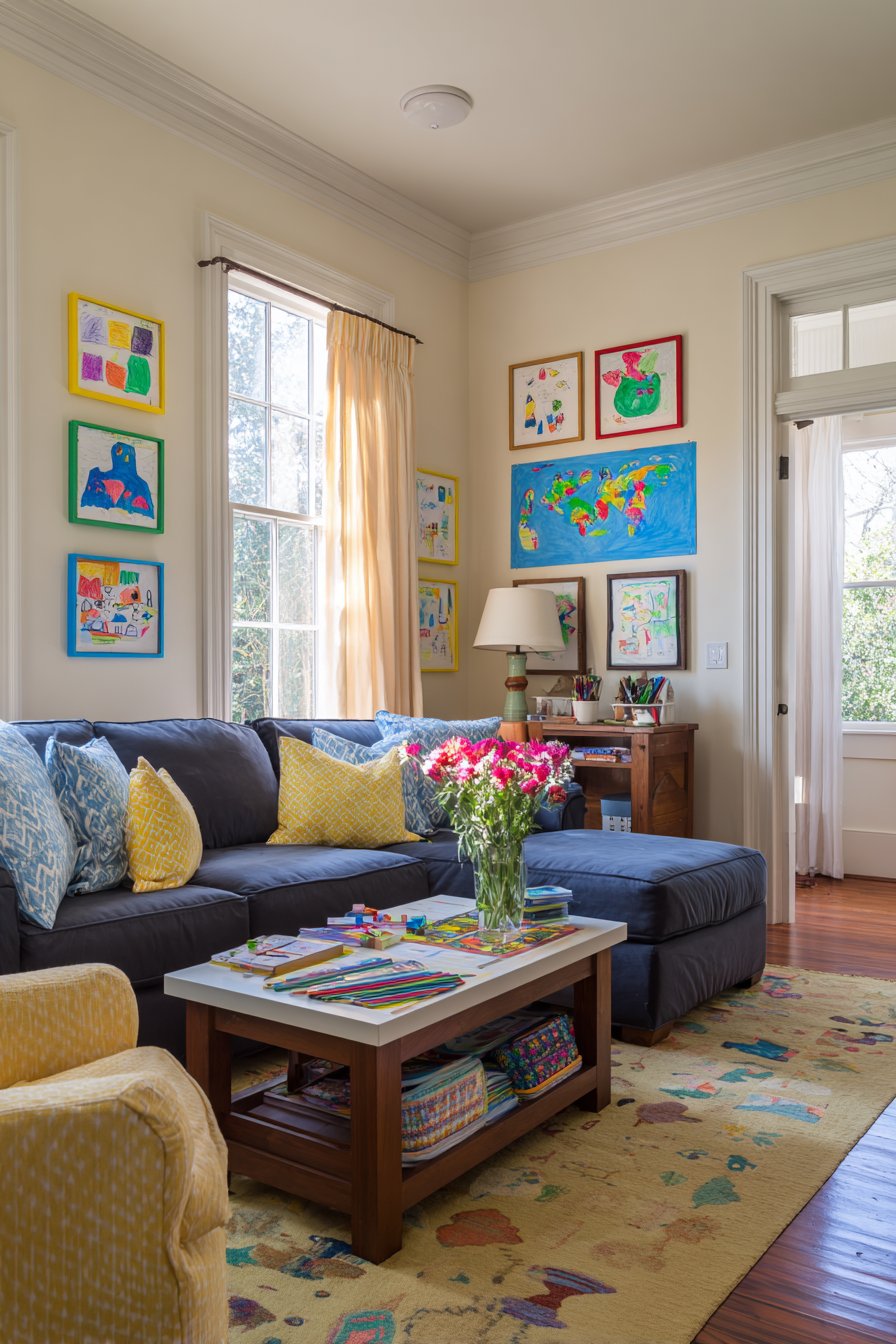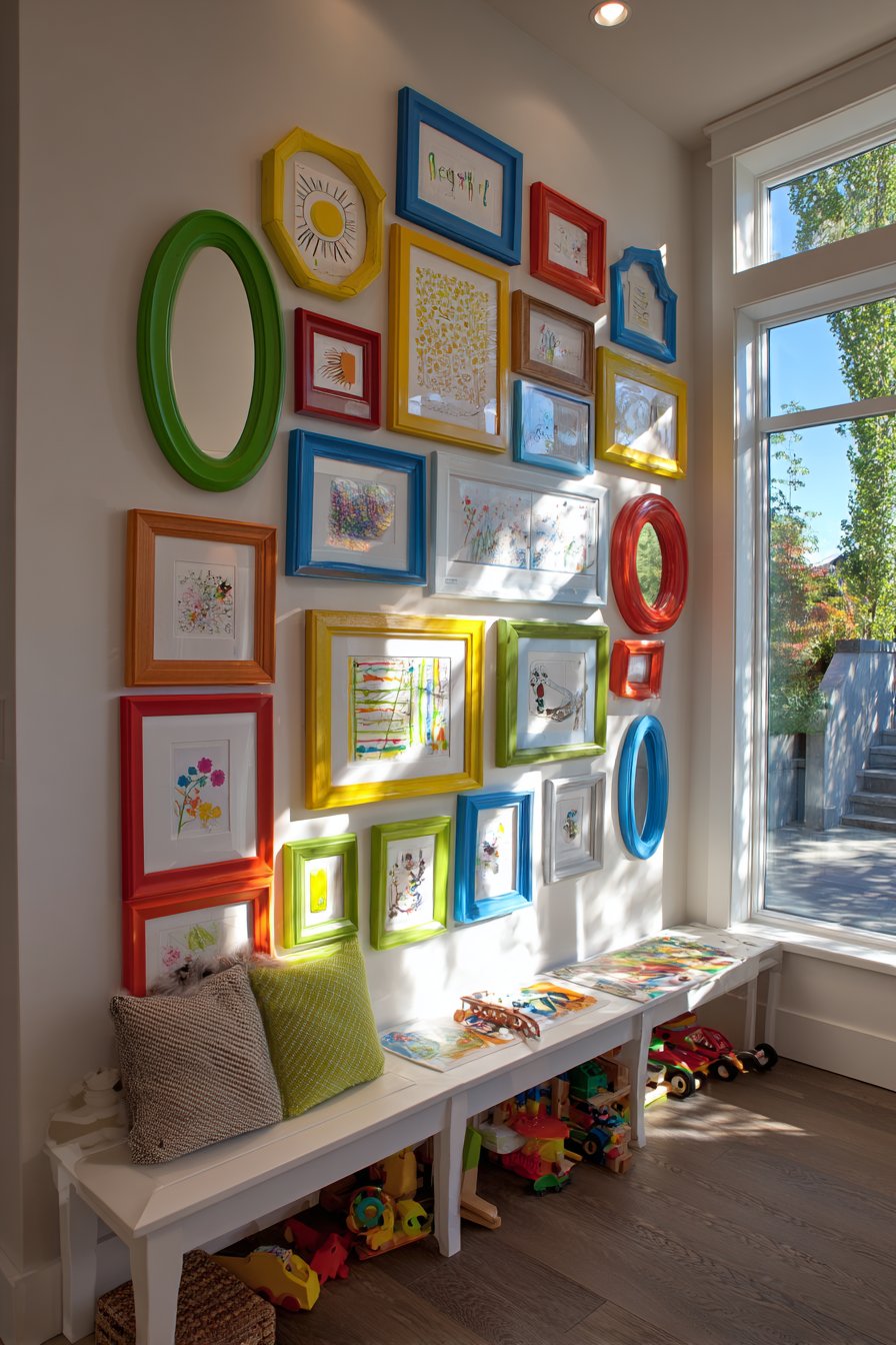 Key Design Tips: Mount frames so the center sits at 36-40 inches from the floor for easy child access. Use lightweight plastic frames with shatterproof acrylic to prevent injuries from broken glass. Create a simple artwork rotation system—a designated drawer or folder where new pieces wait for display. Include a few frames for permanent favorite pieces alongside the rotating displays. Teach children to mat their artwork on colored paper to create consistent sizes that fit standard frame dimensions.