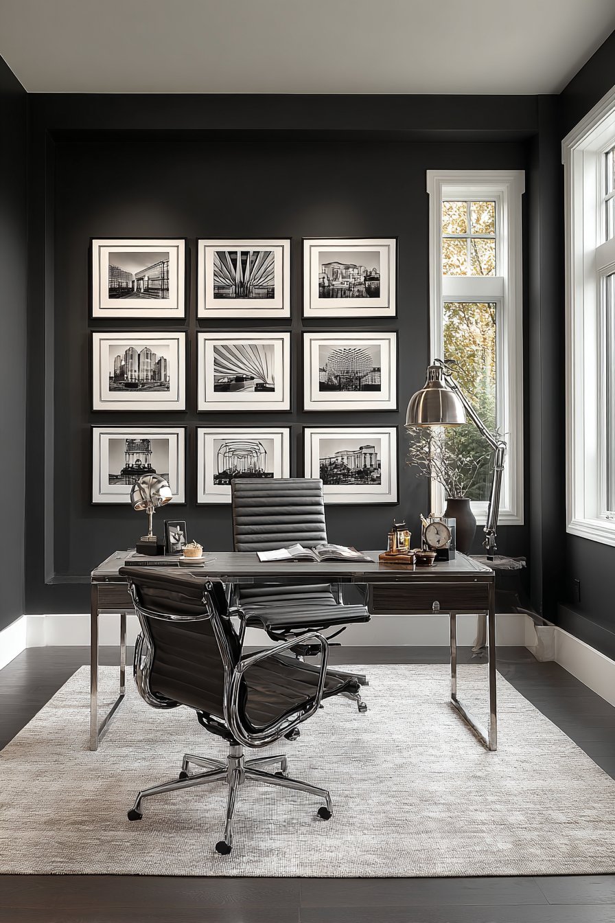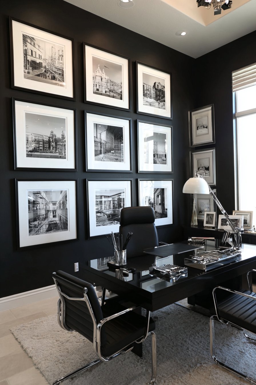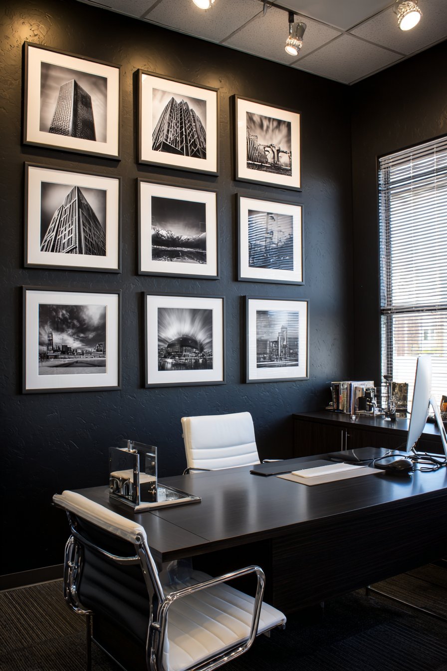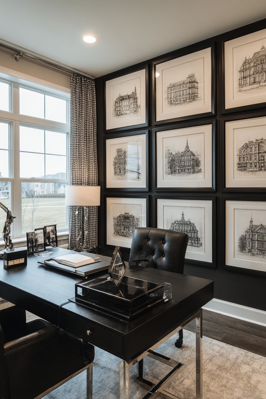 Corporate sophistication meets residential comfort in this home office gallery featuring nine black and white architectural photographs arranged in a perfect 3×3 grid. The identical 16×20 inch black frames with white mats create a gallery-quality presentation that communicates professionalism and attention to detail. Each photograph showcases high-contrast architectural details—geometric patterns in building facades, dramatic angles, bold shadows—creating visual interest through composition and form rather than color. The charcoal accent wall behind amplifies the dramatic quality of the monochromatic imagery while the sleek modern desk with chrome accents below reinforces the contemporary aesthetic.