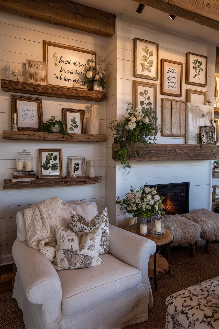 The fireplace mantel has long been a traditional focal point, and this rustic farmhouse gallery wall capitalizes on that inherent prominence. Frames in distressed white, weathered wood, and galvanized metal finishes cluster above the shiplap-clad fireplace in an intentionally informal arrangement. The content—vintage farm photography showing pastoral scenes, botanical prints featuring herbs and wildflowers, and inspirational farmhouse sayings in simple typography—reinforces the agricultural heritage aesthetic. The purposeful informality in spacing and alignment feels authentic to farmhouse style, which values comfort and function over rigid perfection.