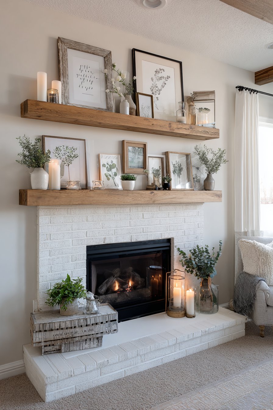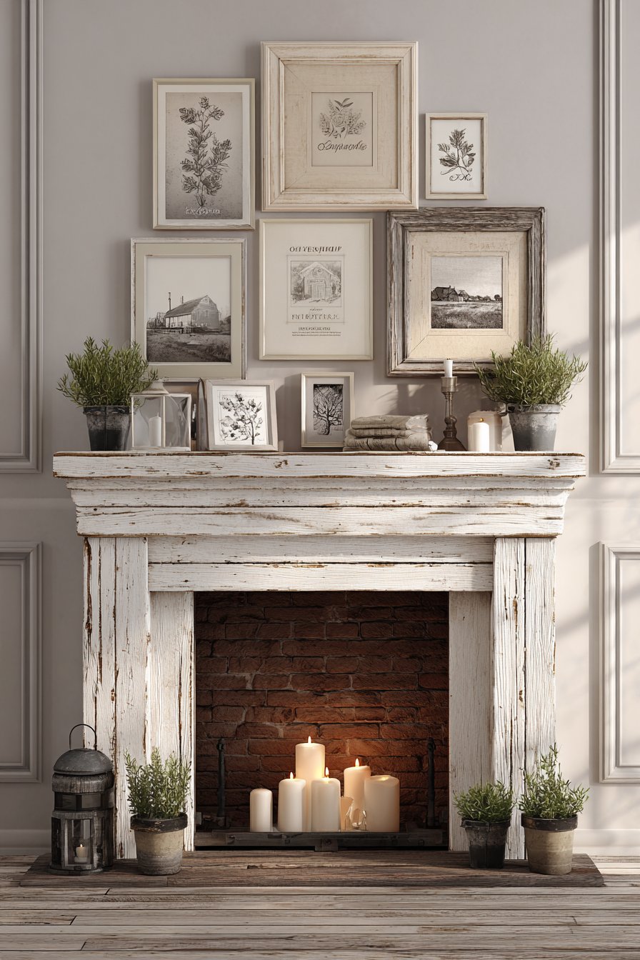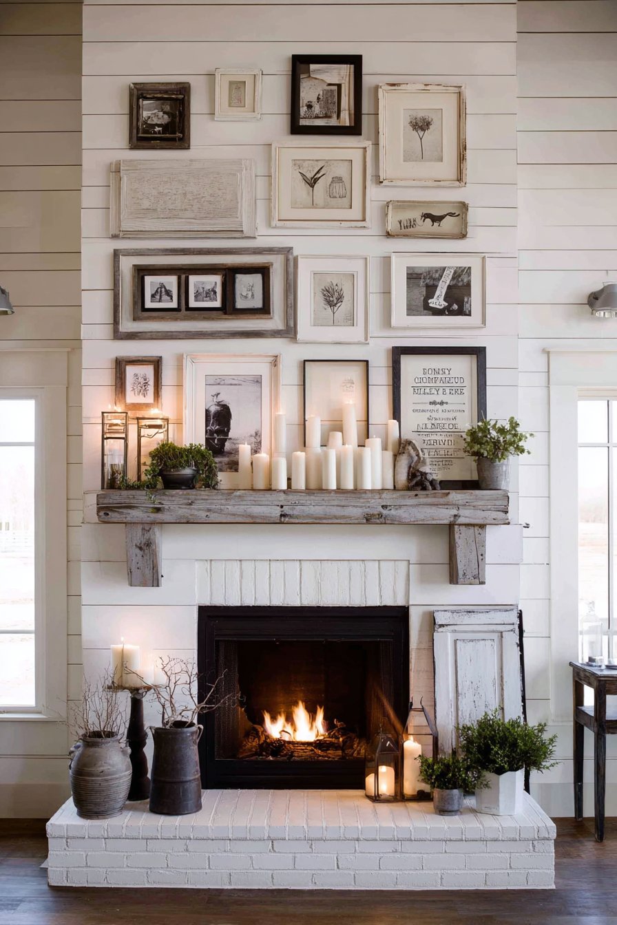 Key Design Tips: Mix three different frame finishes but keep them within the same rustic family—distressed white, natural weathered wood, and metal all complement farmhouse aesthetics. Allow slight variations in frame alignment and spacing to achieve that collected-over-time quality. Include at least one three-dimensional element like a small wreath or architectural fragment to add depth. Position your largest or most important piece above the mantel center, then build the arrangement outward. Leave 4-6 inches between the top of your mantel and the bottom of your lowest frame to prevent overcrowding.